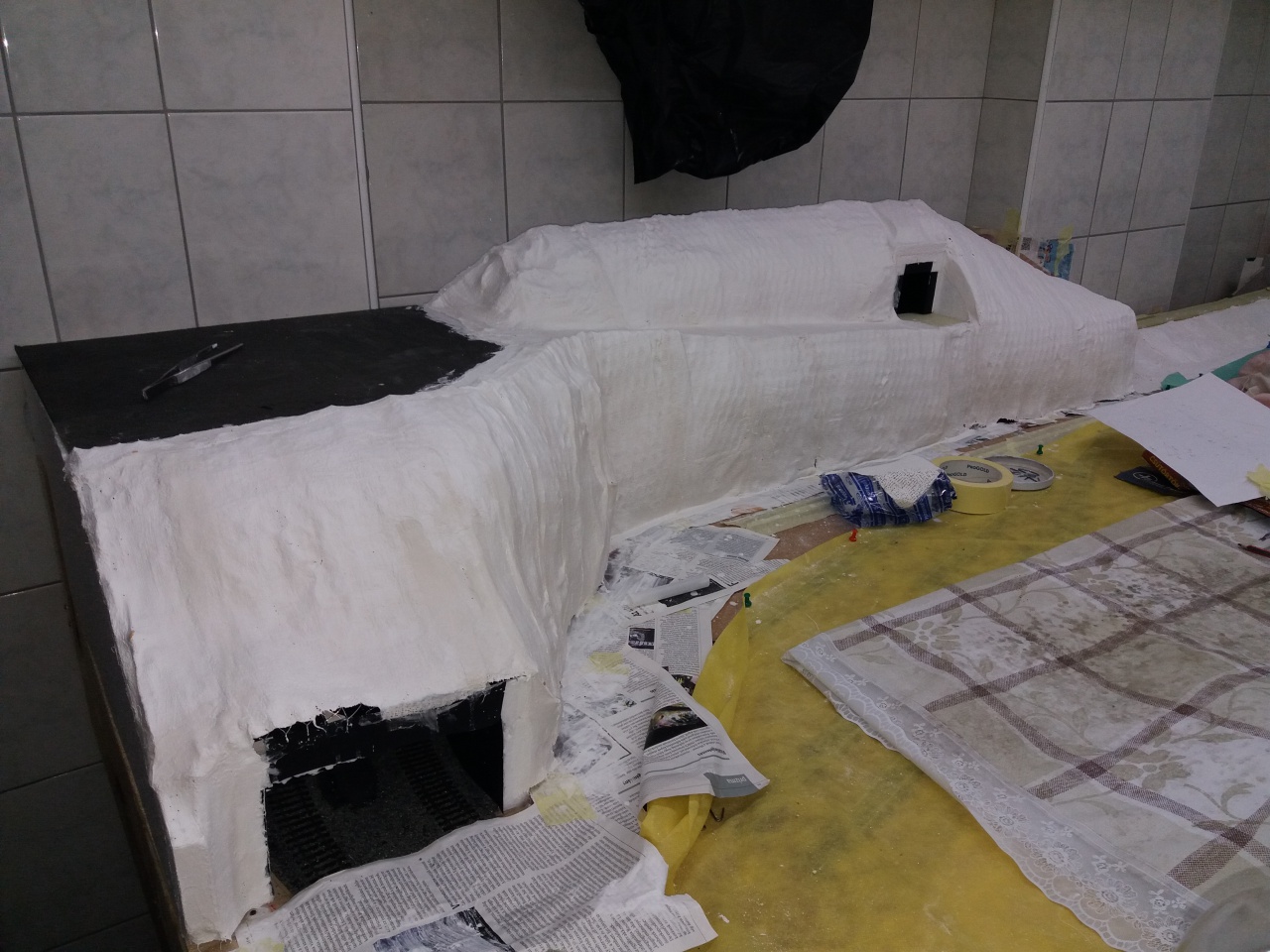 Elöször befestem a felületet a kásával ( szinezöanyagot is keverek hozzá; barna vagy fekete, de nem tul sokat). Erre a még nedves felületre rárakom a papirt egyben vagy kis darabokra tépve. Majd ugyanabból a kásából nagyobb kör ecsettel ráviszek a papirra egy ujabb réteg kását és szépen az ecset szörével benyomogatom az anyagba, igy az pontosan követi a hab formáját. Ha szakad a papir oda kisebb foltokat viszek fel. Egy-két nap száradás után majdnem kökemény lesz a felület. Ahol kell lehet több réteget egyszerre felvinni. A latex aránylag gyorsan szikkad igy 15-30 perc mulva már mehet a következö réteg. |