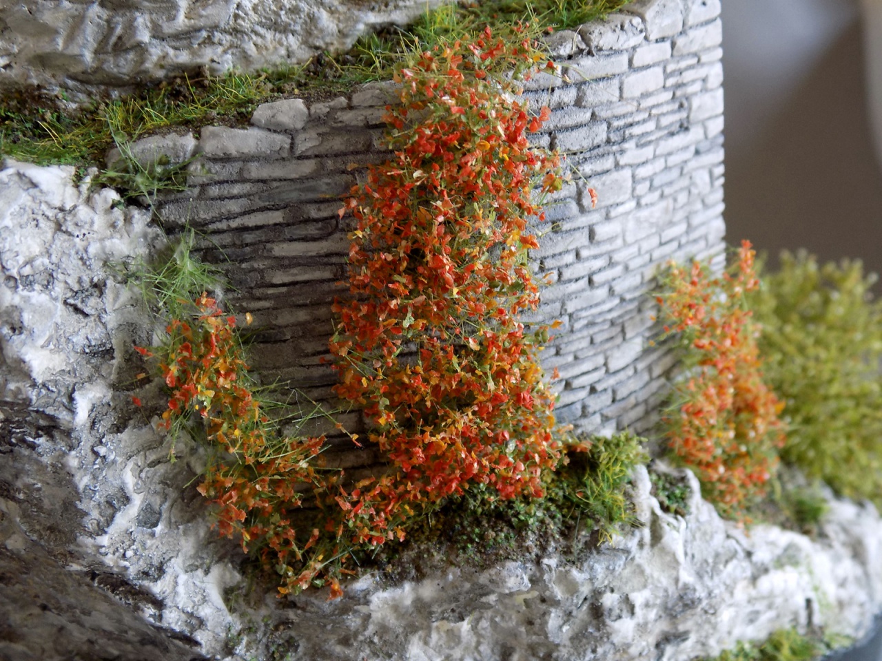 Én inkább a hungarocell féle anyagokat ajánlanám. Forro drottal, forrasztopákával nagyon szépen megdolgozhato majd akril, latex stb festékbe kevert gipsszes kásával szépen lekenyem. Az utolso lépés meg iskolai tubusos vizfestékekkel megadom a végsö szinezetet. Utánna szitán finom zöld fürészporral beszorom, ami a vizszintesebb felületeken megadja a mohát.