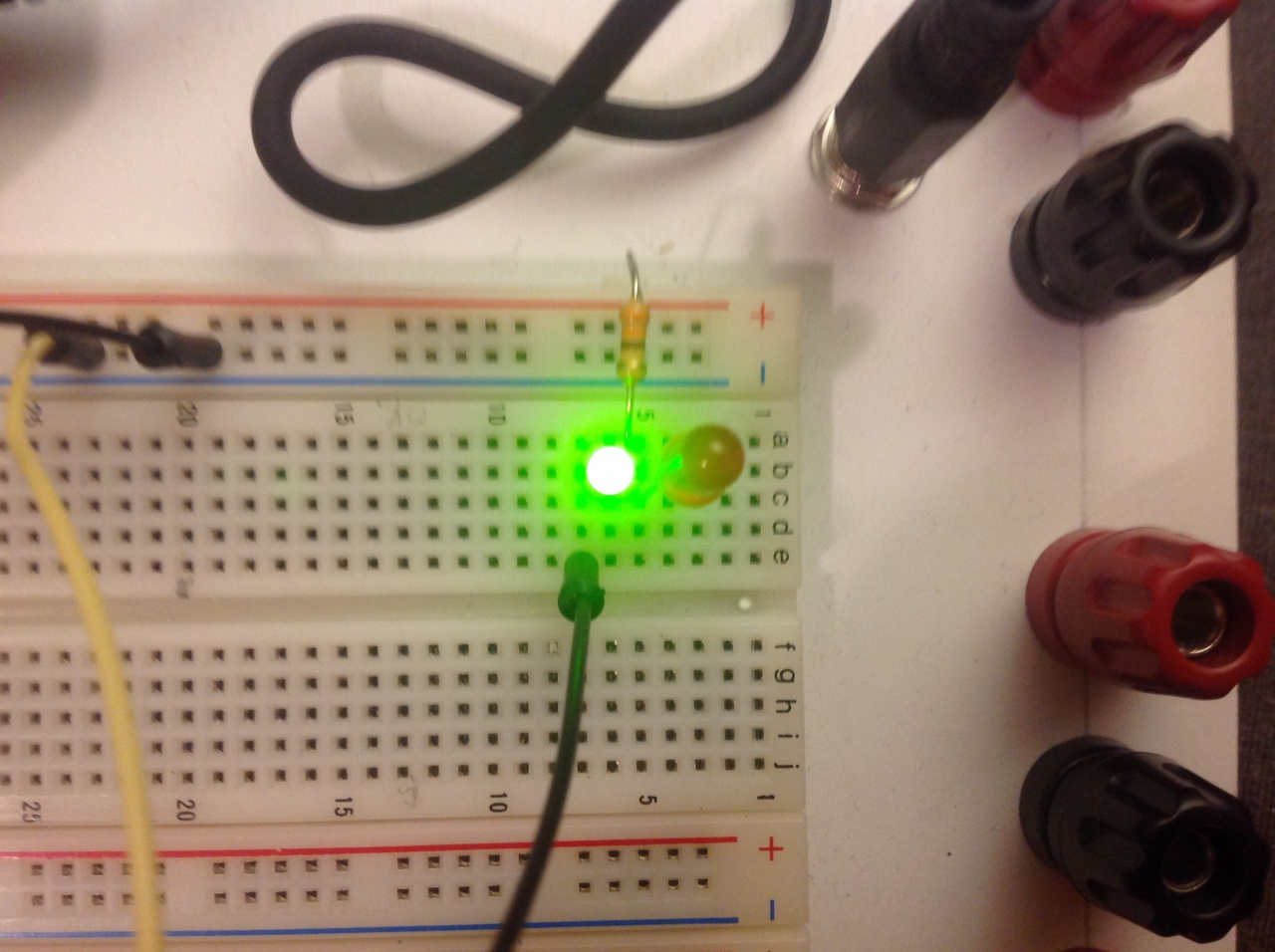 A sárga jumper kábel a GND-t vezeti a piros LED katodjára.