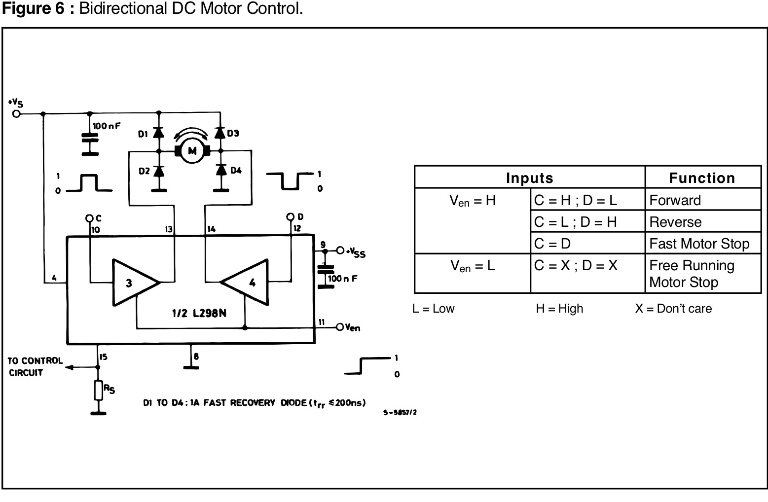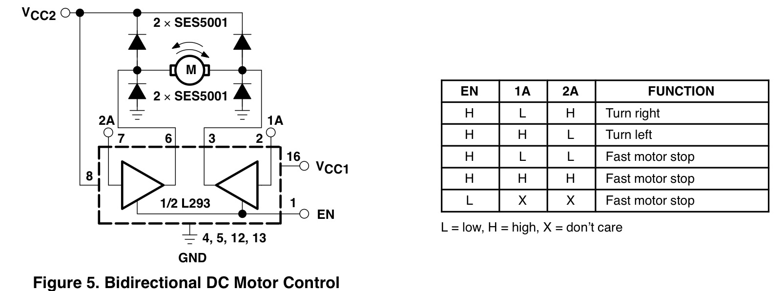 Az IN bemenetek egyszerre vezérlik ellentétes állásokba a hozzájuk tartozó kapcsolókat, az ENA bemenet letiltja az egész áramkört. Ha IN bemenetek egyformák, úgy a híd alsó vagy felső fele rövidre zárja a hídágban lévő motort.