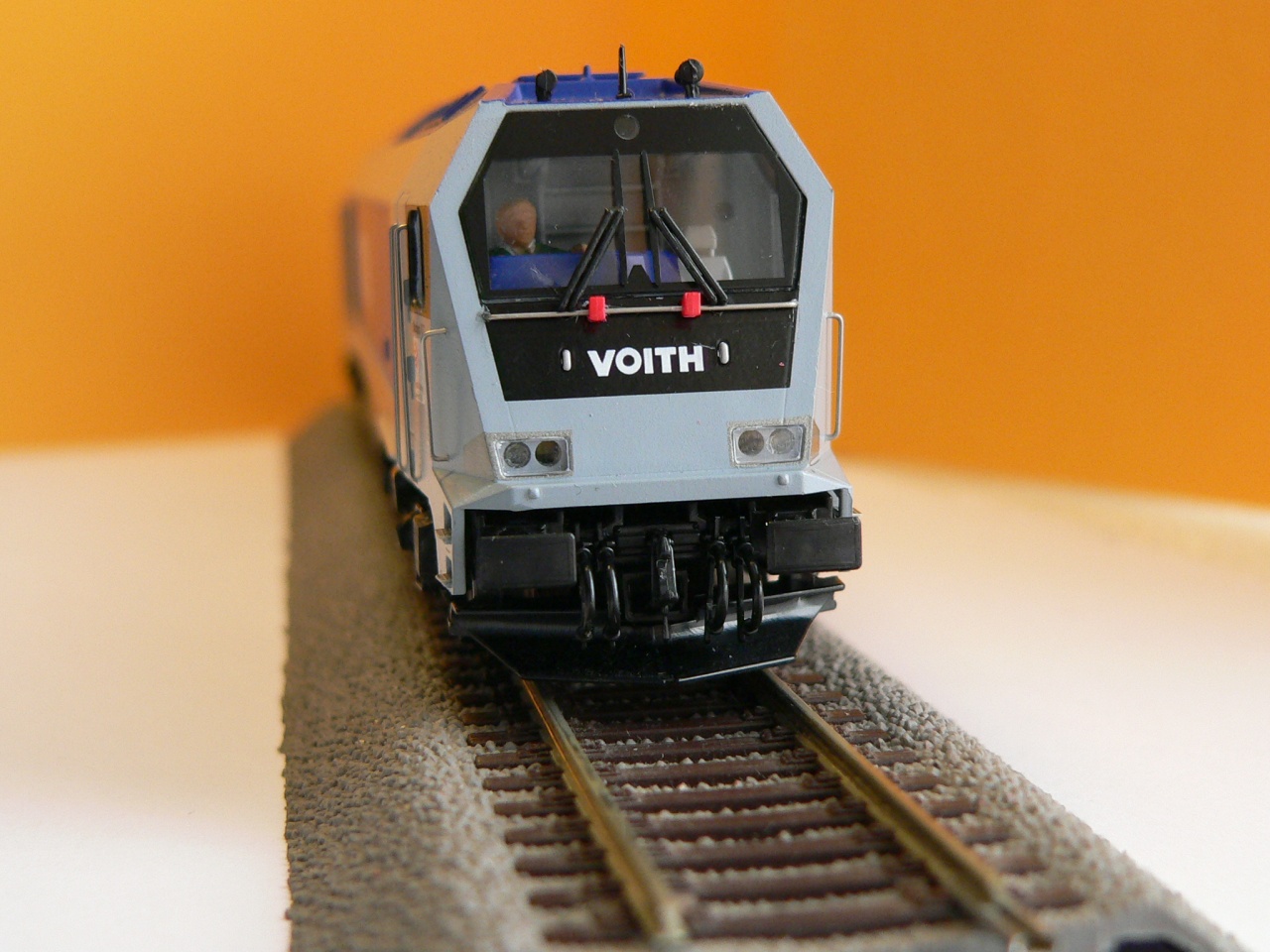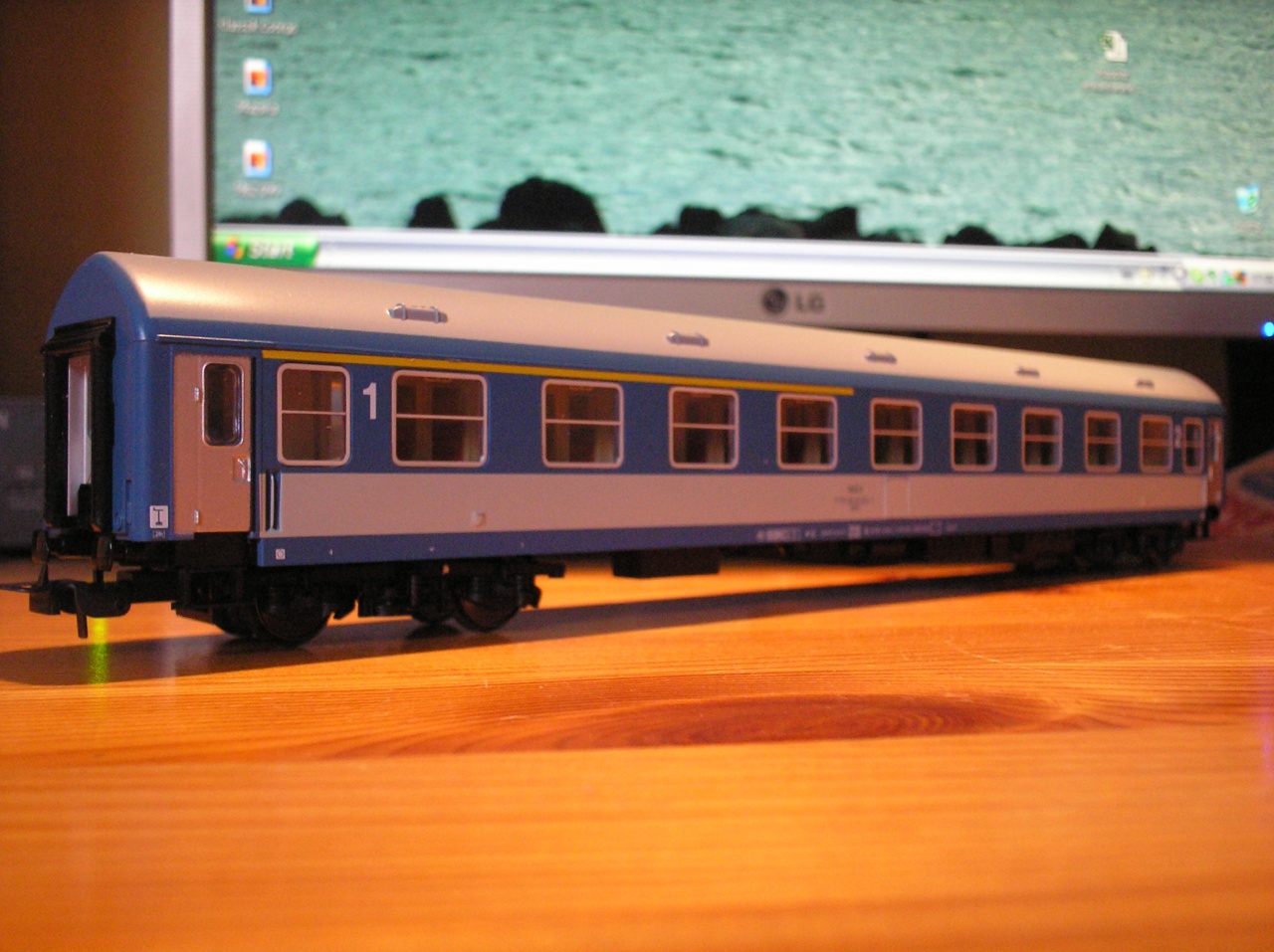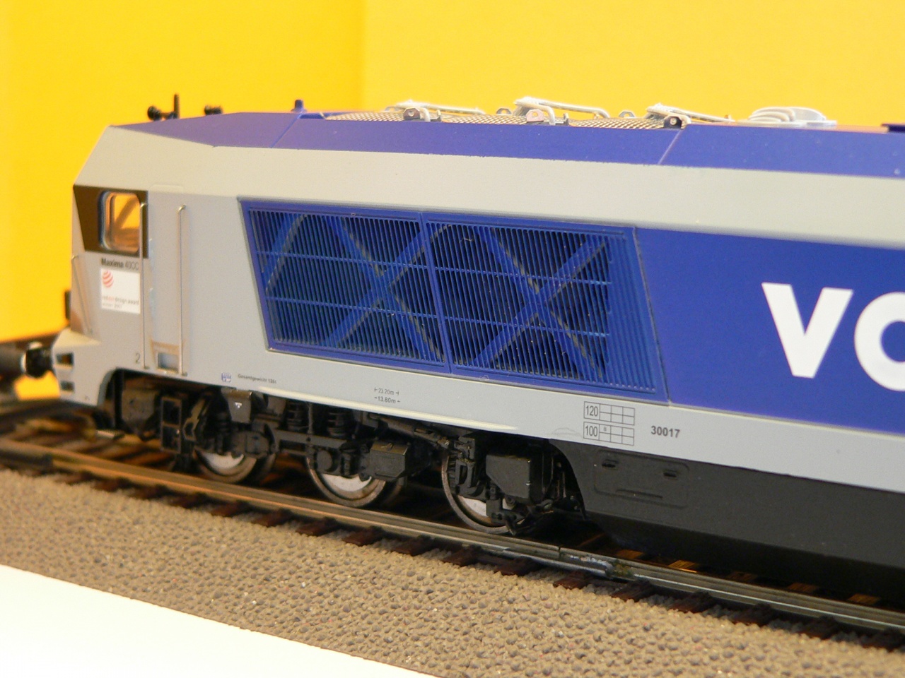 A Sächsichewagonfabrik Stollberg gyártotta. A 2. vezérlőállásnál lévő nagy hütő elötti hűtőrács is maratott rács, átlátható. A forgóvázon a tárcsafékek belső oldala kidolgozzva, valamint a kocsiszekrény is rugózottan van felfüggesztve, oldalanként és forgóvázanként 2-2 spirálrugón nyugszik, a forgóvázak egyenesbe állását stabilizátor rudazat segíti elő. A homokoló csövek tényleg a futófelületnél végződnek. A sok-sok kiegészítő felvitele, ragasztása 2x 7 óra volt. |