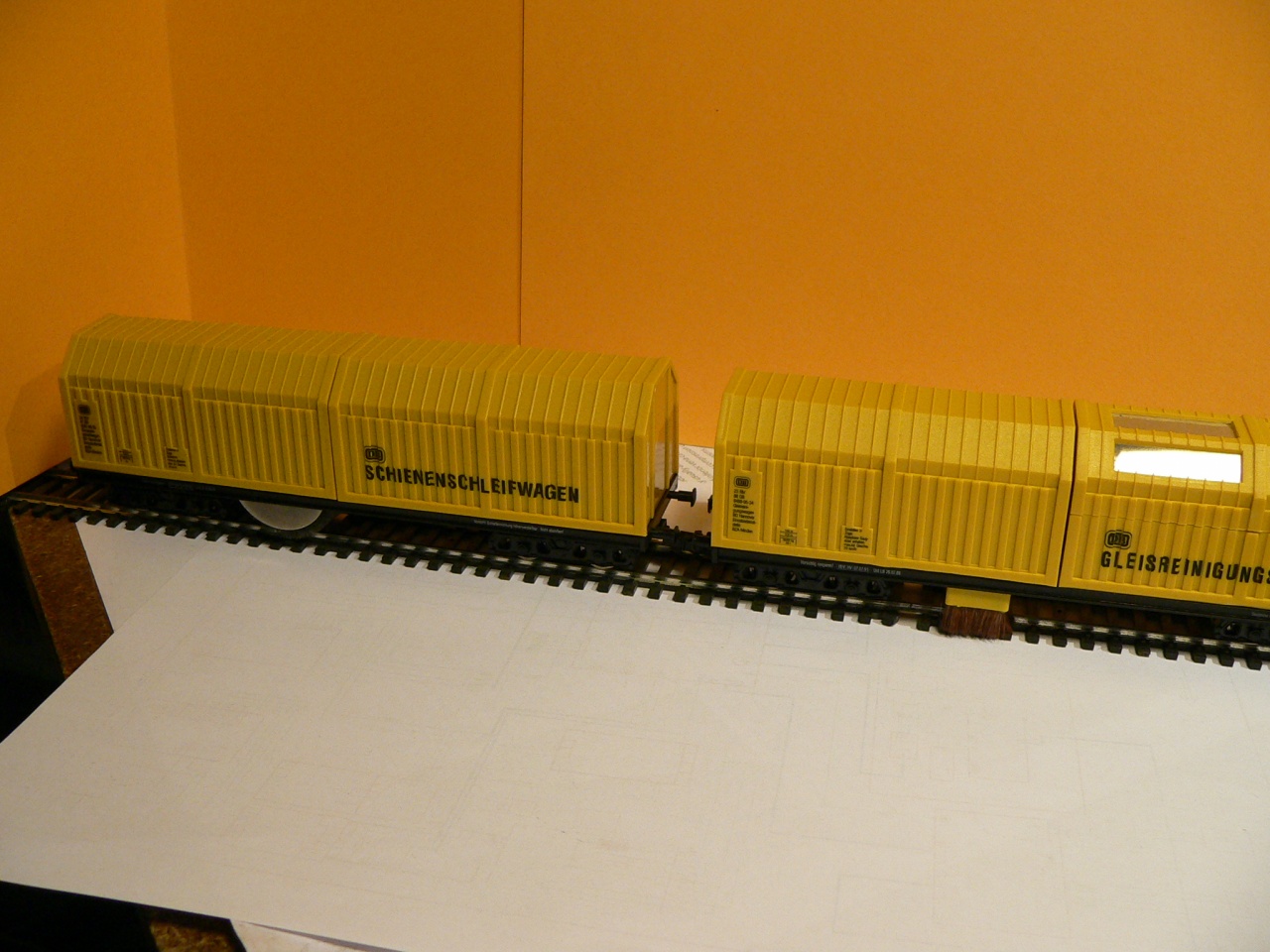 A régi szerelvényem mechanikus és vegyszeres tisztítást végzett, lásd a sintisztitas1 kép. A sárga kocsi mechanikus tisztiotást végzett a fém szivacs segítségével, a zöld belsejében egy tartályban tisztító folyadék segitségével (Kontakt 61) az oxid réteget kémiailag tisztitotta és egy kicsit kennte is a sint. A WD40 sajnos túl olajos emulziót hagyott hátra és ez késöbb csak problémát okozott.