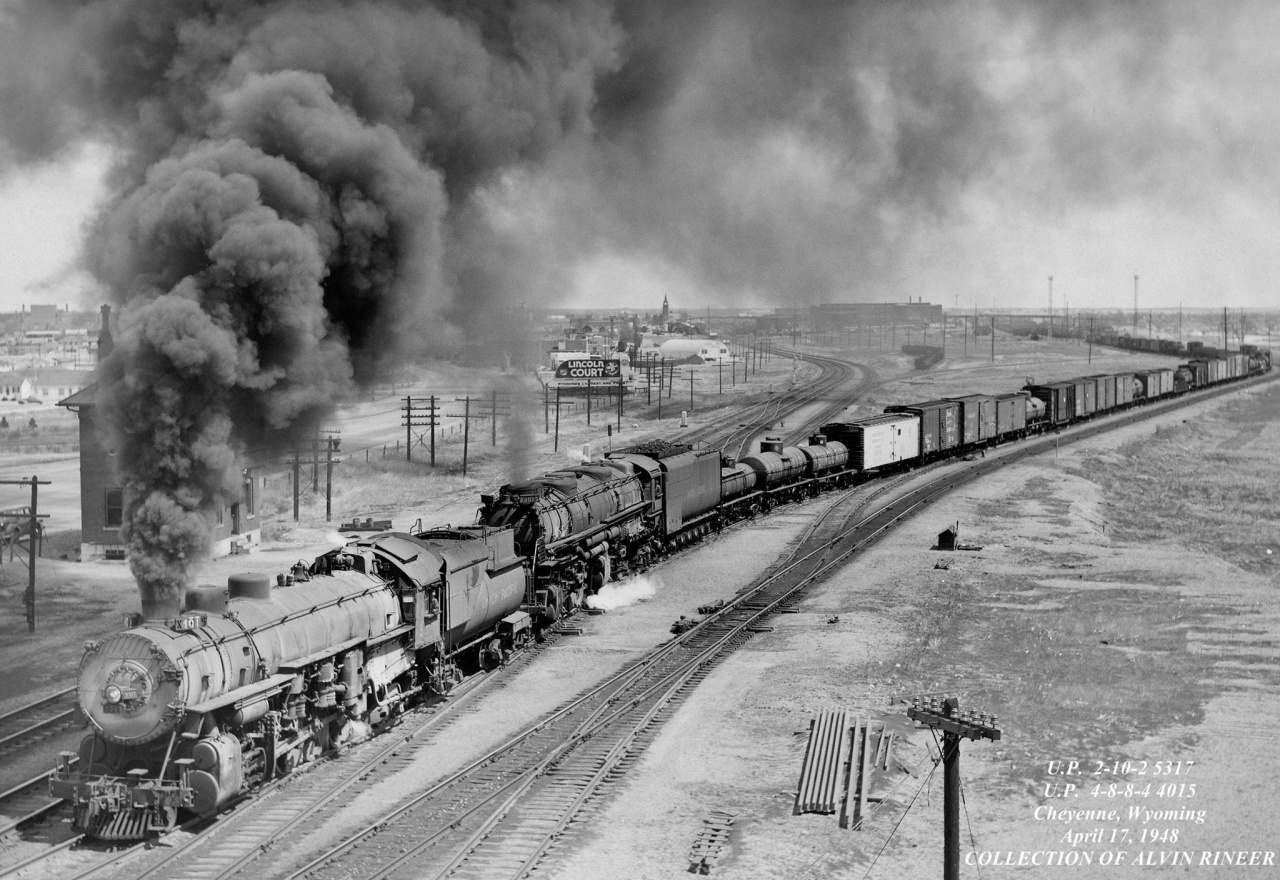 Union Pacific Challenger 5317 és UP “Big Boy” 4015 együtt húz 75 kocsit kereken 70 éve, Cheyenne, Wyoming on April. 17. 1948. Original Black and White Photo by R.H. Kindig Collection of Alvin Rineer