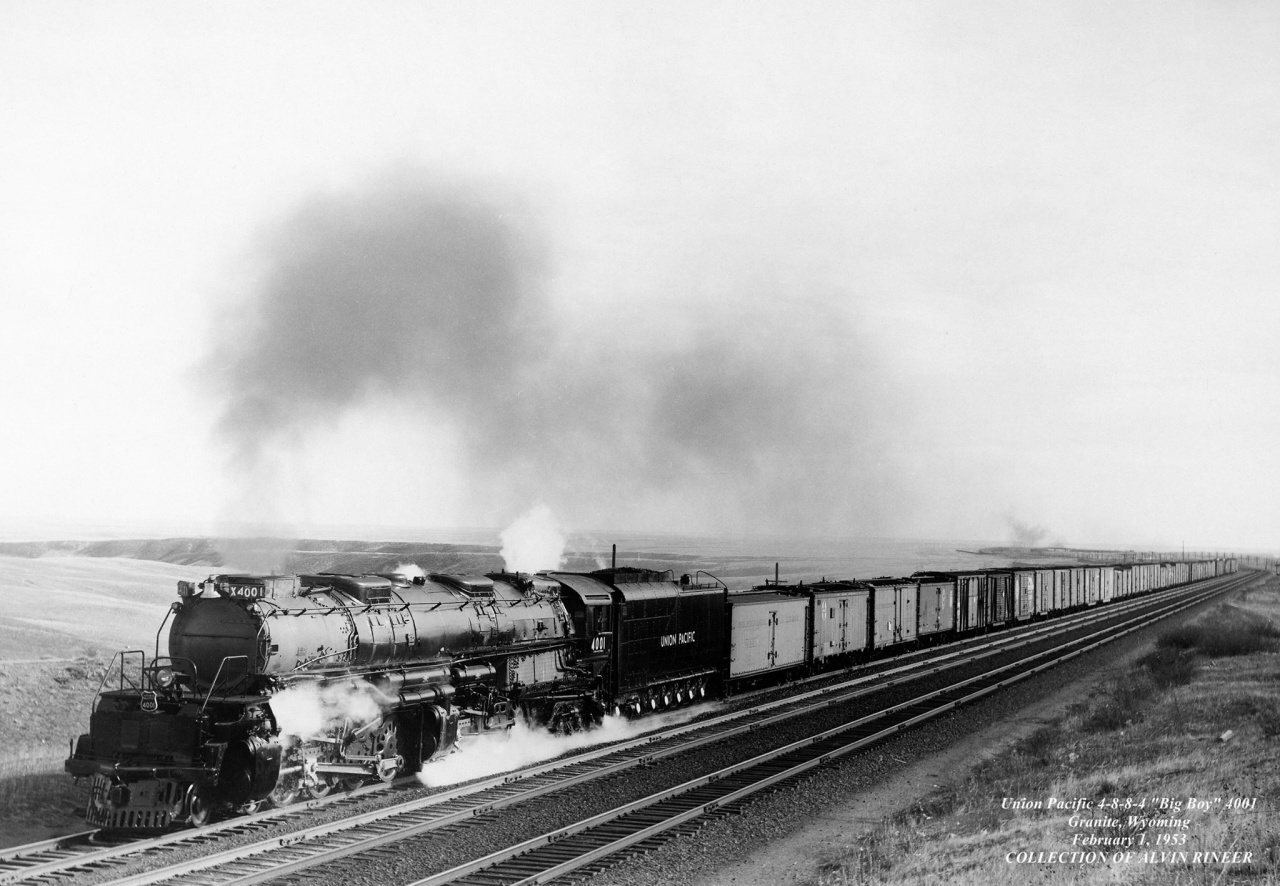 On a Sunny Winter Day in February 1953, Union Pacific 4-8-8-4 “Big Boy” 4001 takes a westbound 45 car train up Sherman Hill through Granite, Wyoming. The 4001 makes it look effortless as it pulls the train over the 1.55% westbound grade of Sherman Hill.