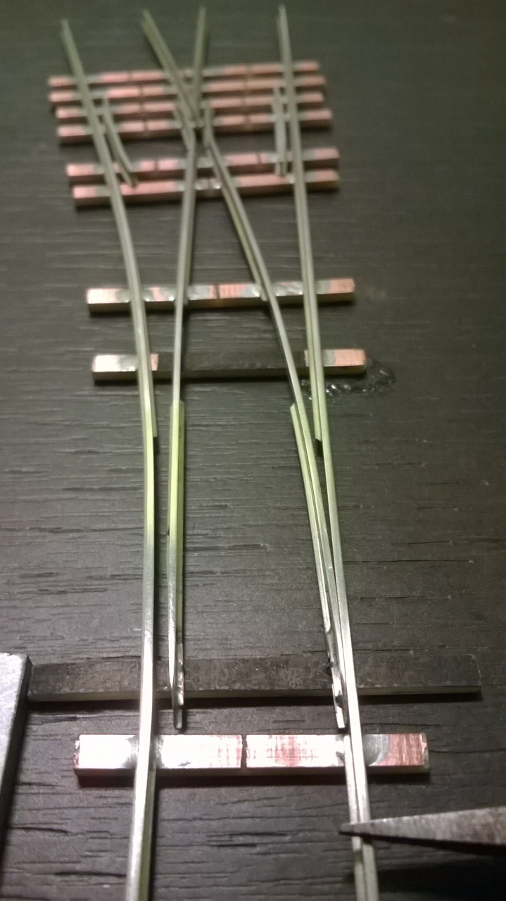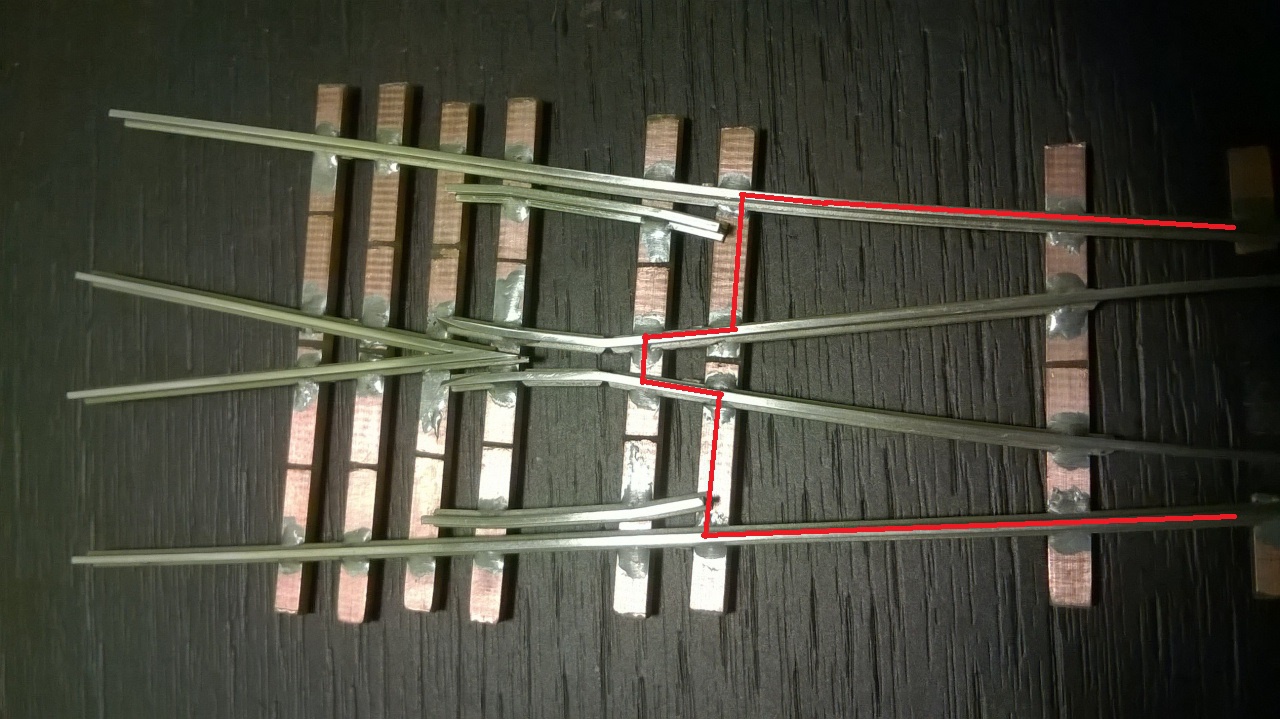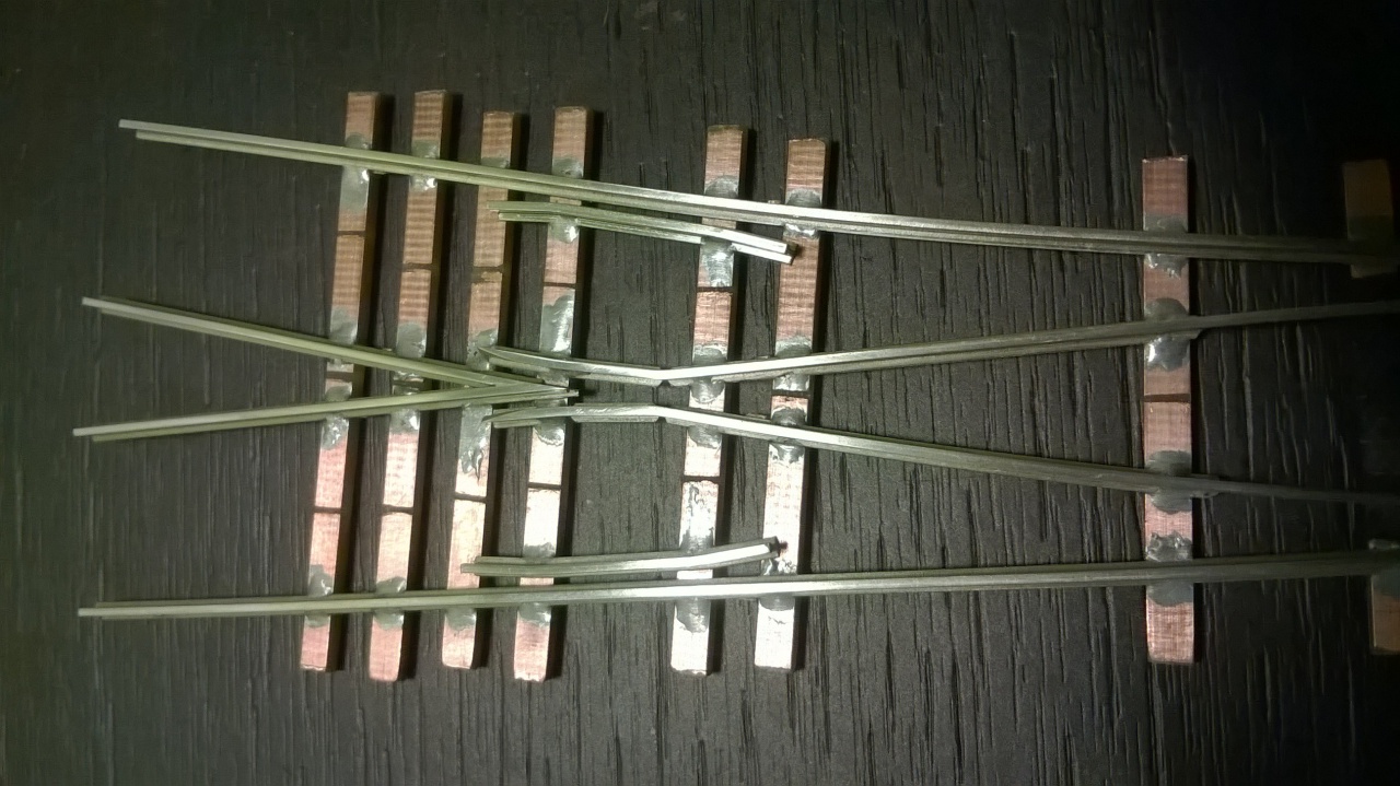 Gödöllői kiállításon jött az ihlet a váltógyártó munkáit látván, hogy megpróbálkozom én is egy kitérőt építeni.Tervezgettem rajzolgattam, aztán nekikezdtem ,elkövetve azt a nagy hibát hogy nem olvastam utána hogy is kellene ezt csinálni  .Tetéztem még ezt azzal hogy egyből egy N méretarányú R3-R4 es hózentróger kitérővel kezdtem.Na szóval olyan is lett!!!1.kép /közepén nem nagyon tudnak átmenni a vonatok,forrasztások nagyok, átvágások szélesek...és még sorolhatnám a hibáit.../Gondoltam nem baj ez a próba majd a második.Ugyan így kezdtem a következőt is csinálni ,és mikor már órák óta szórakoztam azzal miért nem gurulnak középen minden irányban jól át a vagonok belenéztem a fórumba.Láss csodát benne volt a megoldás.Majd írtam a váltógyártónak, és feltettem kérdéseimet amire gyorsan válaszolt, és küldött 15 fokos kitérő rajzát ,hogy gyakoroljak.Szóval most elkezdem ott ahol kellett volna! |