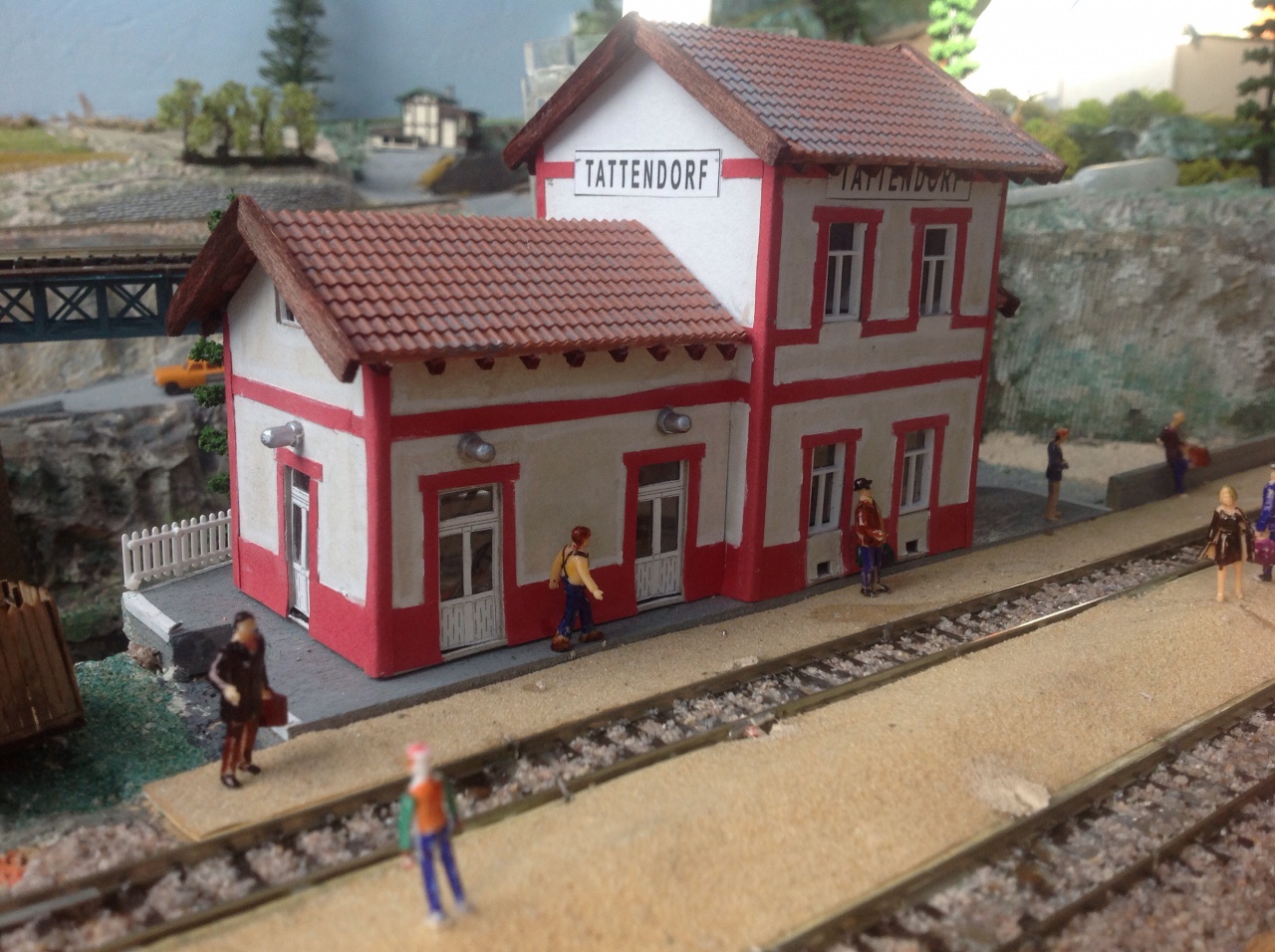 Az alsó állomás 3 átmenő vágányos (50 cm, 85 cm és 100 cm hasznos vágányhosszal), maga az állomásépület a levehető részen lenne jobb alul egy kis városrészlettel együtt. A csonkák, fűtőház elrendezésére több ötlet is van, a képen látható csak az egyik kb. 4-5 közül. A rejtett tároló állhat 2 átmenő vágányból és egy hosszú csonkából vagy akár 3 átmenő vágányból is. Az alsó állomáson és a rejtett tárolóból is lenne kiágazás balra későbbi esetleges bővítéshez vagy vonatkazetták használatához. A mellékvonal jobb hátul indul és két kört megtéve jut fel a felső állomáshoz. Két látható szakasza van, a második egy íves völgyhídon keresztezné az elsőt. Fent kis két vágányos állomás egy enyhe ívvel kicsit feldobva (hasznos vágányhossz kb. 55-55 cm). Az állomásépület hátul lenne pár kis házzal (házak kulisszáival). A két látható állomás közötti terület sziklás-erdős tájjal lenne kitöltve nagyon kevés épülettel (esetleg erdészház, vízimalom, ilyesmi) a zsúfoltságot elkerülendő/csökkentendő.