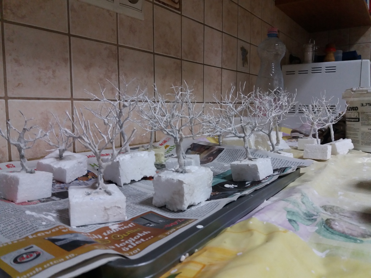 Tegnap megpróbáltam a sima csempe fugázót. Közel puding sűrűségre kikeverve 20 db fát tudtam bemártani, két rétegben  . Miután befejeztem az anyag még kb fél óráig pépes volt. Szilárdulás után ugyanolyan fehér mint a modellgipsz. Úgy érzem ez lesz a nyerő megoldás. |