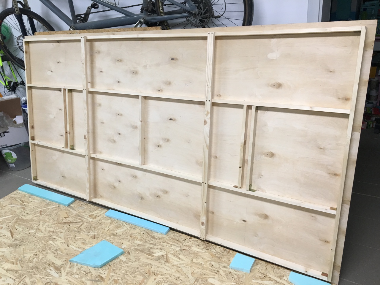 Eddig jutottam, mint a képen is látszik. 250x125x8mm-es rétegelt lemez a lap, fenyőfa lécek merevítik, (két kivétellel) élére állítva.