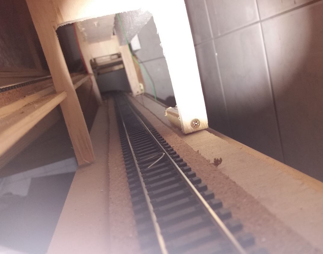 Másik érdekes esemény, hogy mivel találkozhatunk hosszú állásidő után. A pálya próbáját általában a kezdőkészletes ICE szerelvénnyel végzem (azért nem kár címszóval). Minden jól működött, átamszedés rendben. Gondoltam megpróbálom a Nohabot is. Ekkor természetesen a pálya legeldugotabb részét elérve rövidzár miatt leállt az egész rendszer. Vonat kézzel visszahúzva, újra próba, ismét hiba. Miután ezt 5x eljátszotta, (mivel szabad szemmel nem látható részen volt) befényképeztem a lyukba és mit látok. 3.kép. Az ICE még átment az U szeg felett a Nohab alacsonyabb forgóváza minden alkalommal lenyomta a szeget, a két sint rövidre zárva.