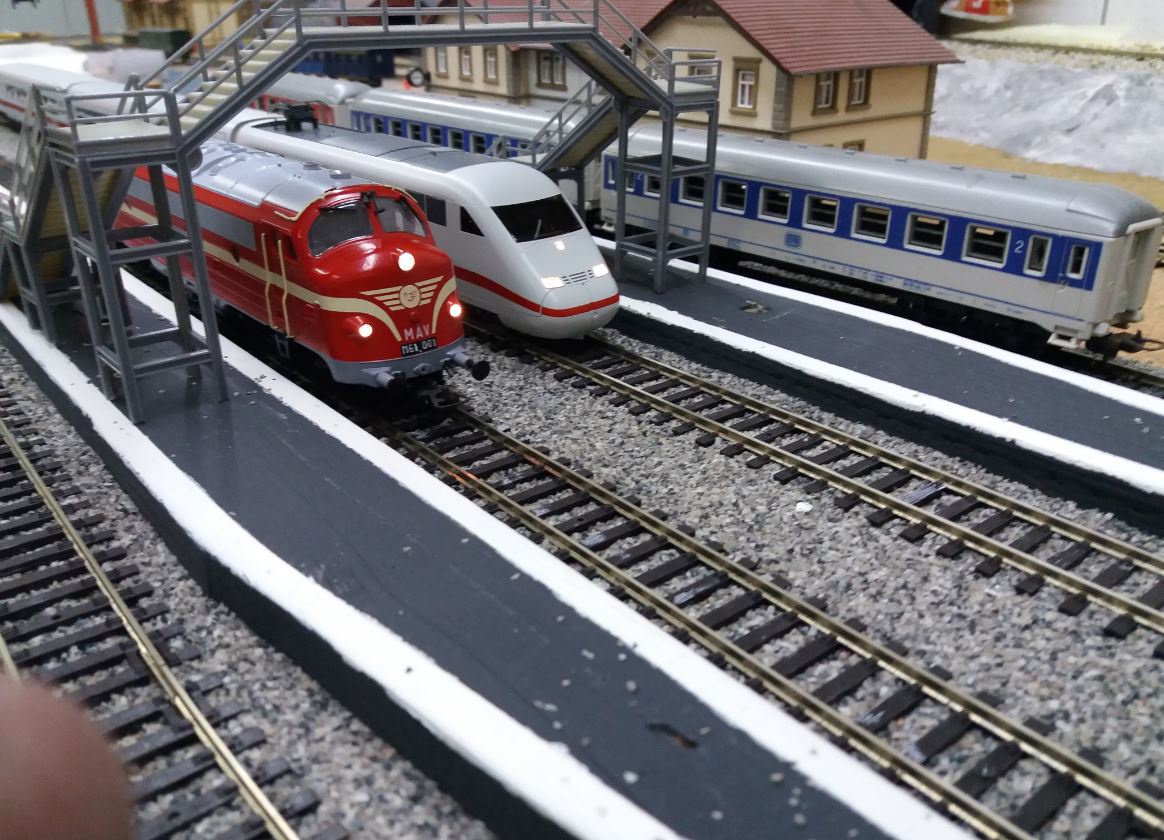 Köszi a fájlt. Első ránézésre a következő észrevételeim vannak. Szerintem is meredek az emelkedő. Én elég sok tesztet csináltam különböző összeállításban. Egy kéttengelyes gőzös 3 db kéttengelyes kocsival nálam felment 4,2%-on is egyenesben. Középen megállítottam és utána símán el tudott indulni. Másik kéttengelyes mozdonnyal már voltak gondok. Ha íves a pálya, akkor már sokkal rosszabb a helyzet. Az előbbi összeállítás csak 3,5%-on ment fel. Sokak véleményét osztom én is, ha biztosra akarsz menni, akkor ne lépd át a 3,5%-ot, de ha kevesebb, az csak jobb. Persze tudom, a helyszűke  . A másik gond az emelkedőiddel, hogy éles függőleges töréssel indul. Persze átmeneti ívet nem könnyű csinálni, de van más megoldás is. Ha van egy kis türelmed, én scarm-ban megpróbálom az általam javasoltakat megrajzolni. A 2.- 3. vágány jobboldali átkötése sem szerencsés, mert sokat veszítesz a hasznos vágányhosszból. Ha megvan a módosított scarm, jelentkezem.