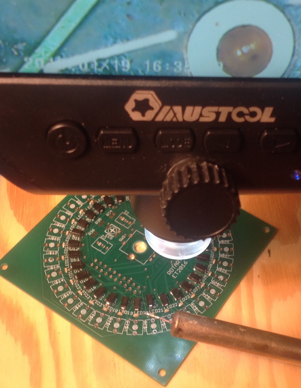 Mind a kettö, azok a kis LEDek nagyon kicsik (0,6x1,2mm). Egy elrepült, hármat meg "szétforrasztottam". Azután megmókoltam a pákát, egy uj hegyet kapott 0,8mm-s ezüstdrotbol. Azzal már a mikroszkop alatt is tudtam dolgozni.