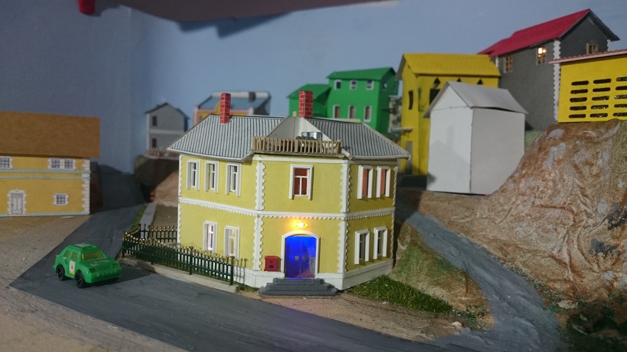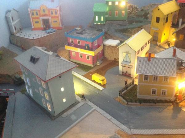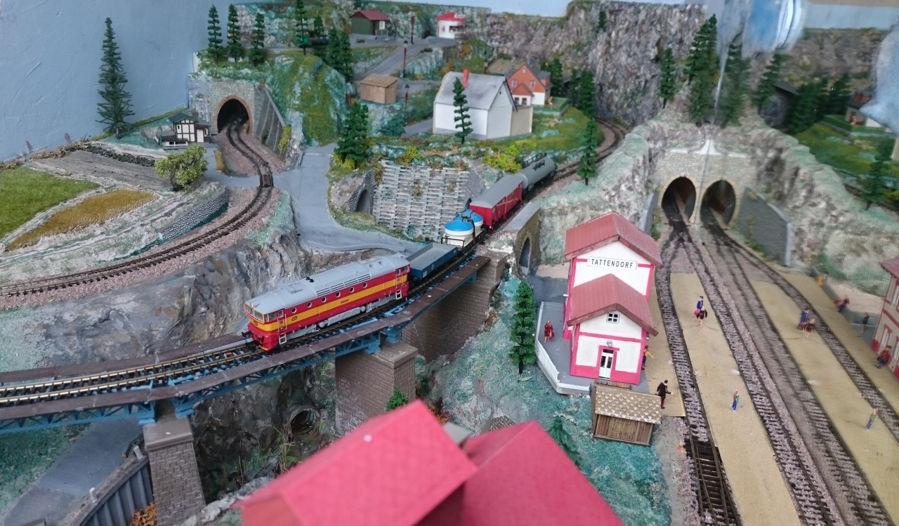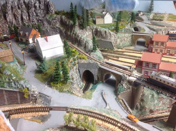 Végre megy az egész pálya. Még a vezérlöpult nincs teljesen kész, de már bejárhato minden vágány. Nem volt egyszerü dolog, egy halom elektronika, rengeteg sok polusu csatlakozo ( hogy a terepasztalt szét lehessen szedni), vagy 30 foglaltságérzékelö ( pillanatnyilag még csak részlegesen kétirányu). Az állomás okozta a legnagyobb problémát a rengeteg összefüggés kezelése elég sok elektronikát meg relét emésztett fel. A pálya kikerülheti a fö pályaudvart, igy ott a vonatok zavartalanul mehetnek, mig a nagy pályaudvaron manuálisan lehet a vonatokkal dolgozni, szerelvényeket összeállitani stb. |