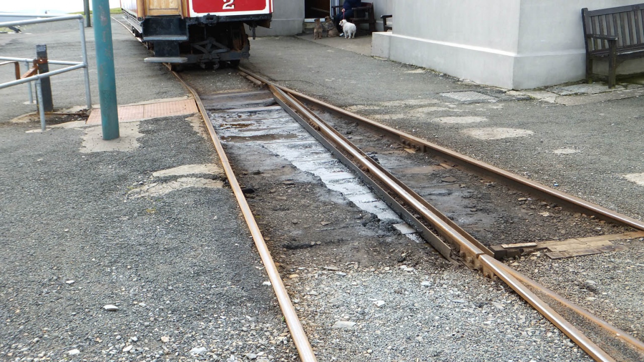 Nyilván nem a nagyvasúti 25 kV-os hálózat, na de akkor is! Ami ennél sokkallta bizarrabb látvány, az a váltó csúcssínje: se gyökkötés, se sínszék, csak úgy odab...va a földre! Értem én, hogy itt egy siklás nem akkora súllyal esik latba, mint a nagyvasúton, de azért ha egy csille (még ha üres is) ráborul valakire, na az aznap este már nem kér vacsorát... |