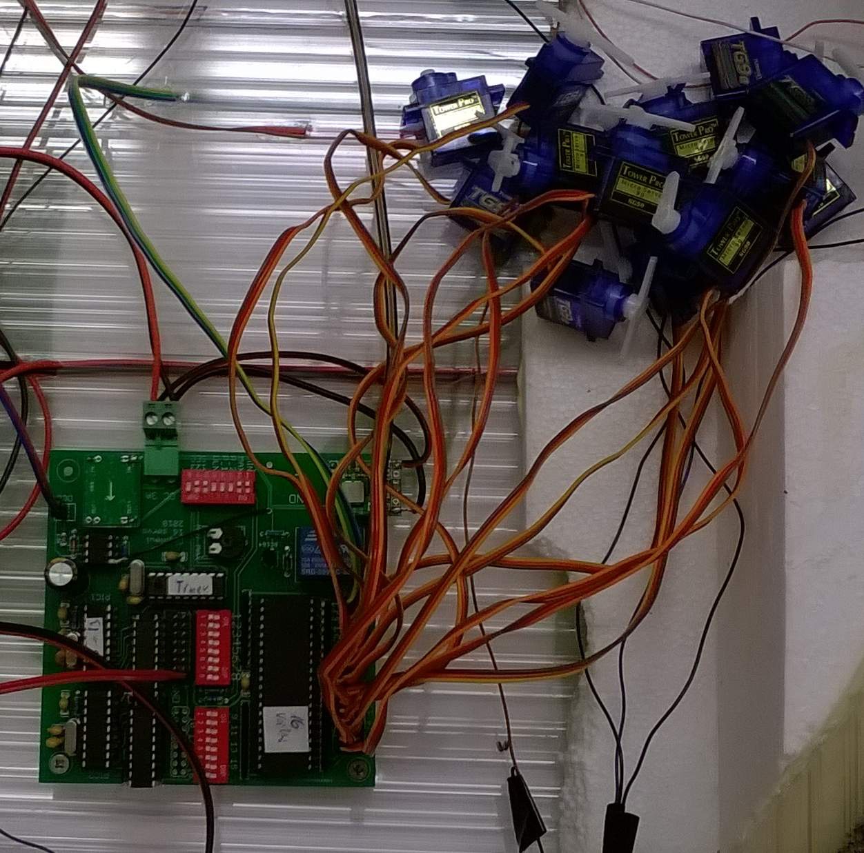 Kipróbáltam PC-tápról is ugyanezt. Ha az 5V-os ágba tettem bele a szervó, és az időzítő kört is, akkor az időzítő, mindig lehalt, pedig a táp 25A +5V-ot tud.  Azaz a szervók, irtózatos áramot rántanak le, főleg így 16-an. Ezért tettem bele az időzítőt, ha több ilyen egységet szeretnék, akkor azok más-más időpontban éledjenek.