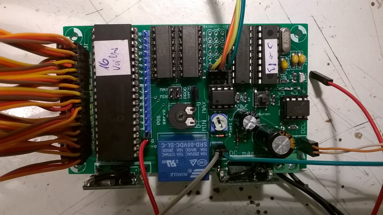 Az áramkör működik... csak a 16F887-es Geert úr programja tréfált meg. A pic ugyanis felejt. Az első 8 szervókimenet pozícióit szépen megjegyzi, a második 8-as csoportban a legtöbb esteben nem tárolódik le a pozíció. Kikapcsolás után elfelejti. Ezen a magam módján tudok segíteni. (az első nyolc értékek kiolvasom pickit2 íróval, és átírom a másikba. Így megint van 8 csatorna ami felprogramozható. Kicsit nyakatekert de DIY-ben működik)