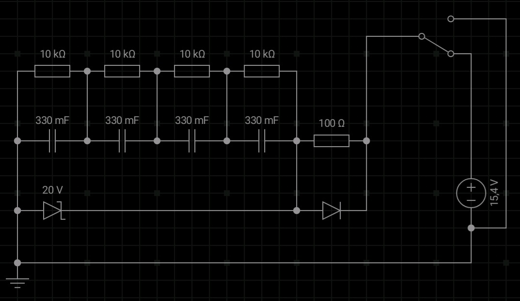(A rajz -gondolom- csak vázlat... A kapcsoló alsó állásában a 15V-ról az ellenálláson keresztül feltöltődnek a kondenzátorok, a kapcsoló felső, vagyis az ábrázolt helyzetben pedig a feltöltött kondenzátorok teljes energiája átmegy a diódán. Vagyis megkapja a teljes 15V-ot nyitóirányban... ez sem egészséges.) |