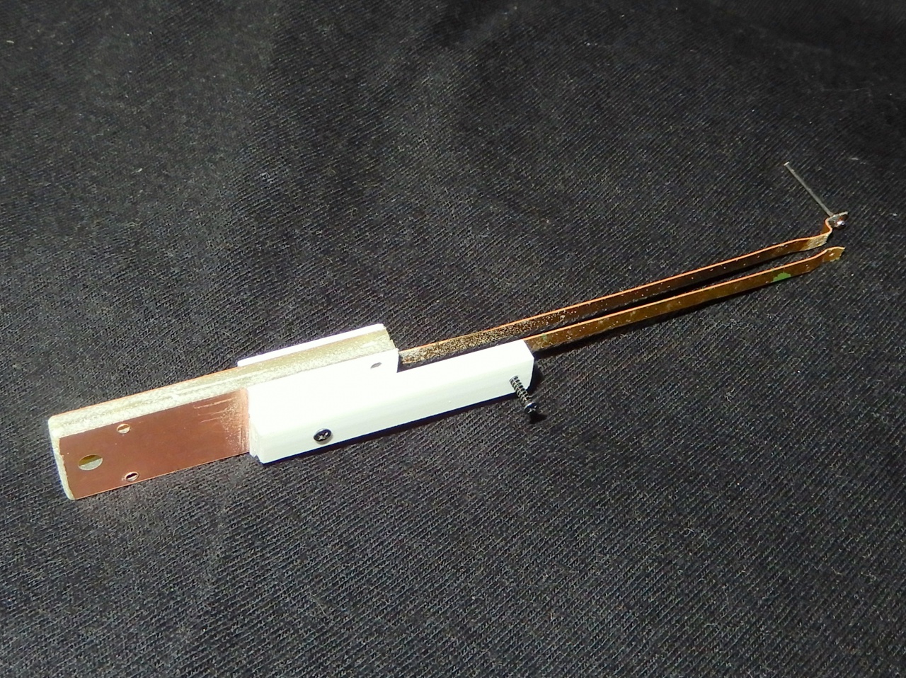 Relatív hosszú az érintkező (~ 50-60mm) elképzelhető, hogy már kis erőhatás hatására zárni tud. Ebben segít az előfeszítő kis fekete kereszthornyú csavar, mellyel a légrés állítható. Bár hiányolom a jelfogó rugóra ponthegesztett érintkezőt -ket ami a biztos érintkezéshez szükségesnek tartok. A működési úthosszat (távolság) kb. 0,4-0,5mm- re kell beállítani. Ha megfelelő alapanyagot (jelfogót) talál, bont az ember ilyen jelfogó rugó beszerezhető: pl a régi telefonközpontok jelfogóiból.