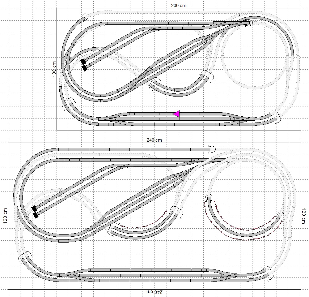 Minden intelmetek ellenére megpróbáloztam újrarajzolni a tervet spirállal és úgy tűnik a mutatvány egészen jól sikerült. A boldogság egészen egy napig tartott, mert rájöttem, hogy az egyik mozdonyunk nem fordul el 310mm rádiusz alatt. Hirtelen felindulásból átrajzoltam a tervet 310mm-es ívekkel a 267mm-esek helyett és nem meglepő módon az asztal mérete is szépen megnőtt. Ez persze helyhiány miatt nem fér be a lakásba, így maradt a totális átgondolás és újratervezés. Ebben nagy segítség volt, hogy időközben szereztem (vásároltam) néhány TT pályatervet és az egyik módosítása után született egy talán egészen jól használható. Igaz, hogy csak egy szintes, de van 3 független kör, amin a gyerek boldogan körözhet a 3 mozdonyunkkal és még szerelvényeket is lehet rajta pakolgatni. Kérlek nézzetek rá és véleményezzétek, hogy szerintetek rendben van-e a pálya vonalvezetése. Köszi előre is! |