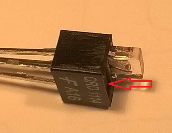-QRD érzékelő. Véletlenül jöttem rá, hogy a tokból a LED, és a tranyó is könnyen kiszedhető. Ha fordítva teszem vissza pl. a LED-et akkor könnyű a közös GND-t kialakítani, és a lábakat elvezetni. Visszarakás után derült ki, hogy gyárilag nincsenek "leültetve" a helyükre az alkatrészek a tokban...  Ezt érdemes megcsinálni egy pici nem karcoló pl. műanyag darabbal mind a két egységben. Így sokkal csőlátóbb lesz az érzékelő (piros nyíl - ültetett). Így "leültetve" az érzékelő, a síntől távolodva közép irányba 2mm-re már nem ad hibás jelet, a sín tükröző hatása miatt. (TT-ben, talán N-ben is felhasználható így).
