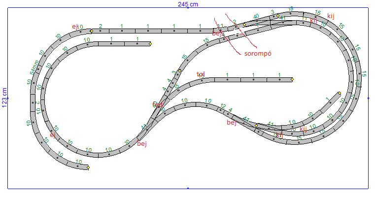 Nem tudom mennyi szigetelés kell,de minden vágányra külön kijárati jelző lenne,illetve a nagy állomásra bejárati is. Alul a jobb sarokban a két vágányon sorompó,itt előjelzők nem lesznek mivel nincs hely,és a huroknál sem kel alul jelző.Felül lesznek előjelzők bejárati,kijárati,delta vágánynál egy fedező,iparnál egy nem biztosított tolatásjelző és egy sorompó felül is a bal felső részen a két váltó előtt szintén a két sínszálon.. A hózentróger kikerült felesleges és csak a baj lett volna vele.. |