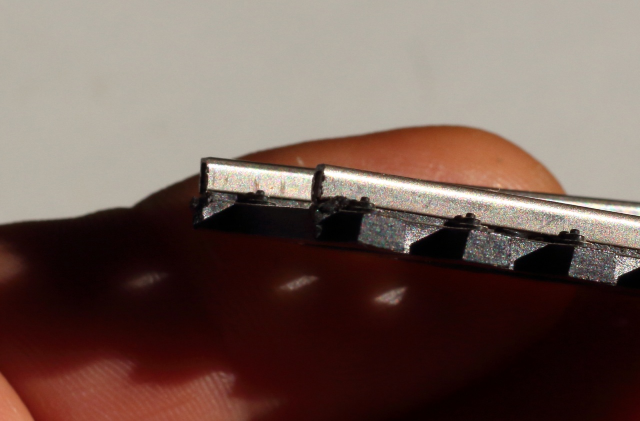 Itt vannak az ígért képek. Közvetlenül a vágás után készültek, még nem volt manikűrözés tűreszelővel, tehát minden sorjás, de a lényeg talán látszik. A sín egy 10-es ívesből (760 mm) lett vágva. Scarm-ból 1:1-ben kinyomtattam a teljes sínt és a kivágást is, így jelöltem át a sínre a pontos vágási helyeket. Az elsőn a vágás utáni állapot látszik. A második képen a vágási felület látható közelről, oldalról. A galvanizálásnak semmi baja. Visszatérve az elsőre, jól látható, hogy az U profil belseje nem üres, tehát nem lehet az összekapcsoló fülecskét a helyére tolni. A harmadik képen az U profilt leszedtem, és így láthatóak a sínt pozicionáló kis műanyag bakok. A vágás mellettieket kell reszelővel, vagy mini flex-szel leszedni és így már csatlakoztathatóak a sínek.