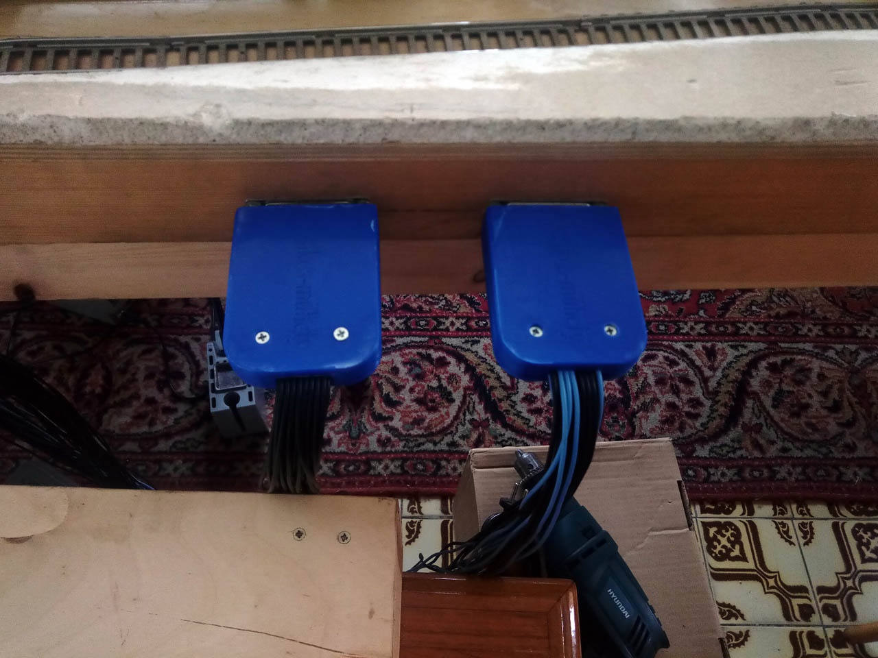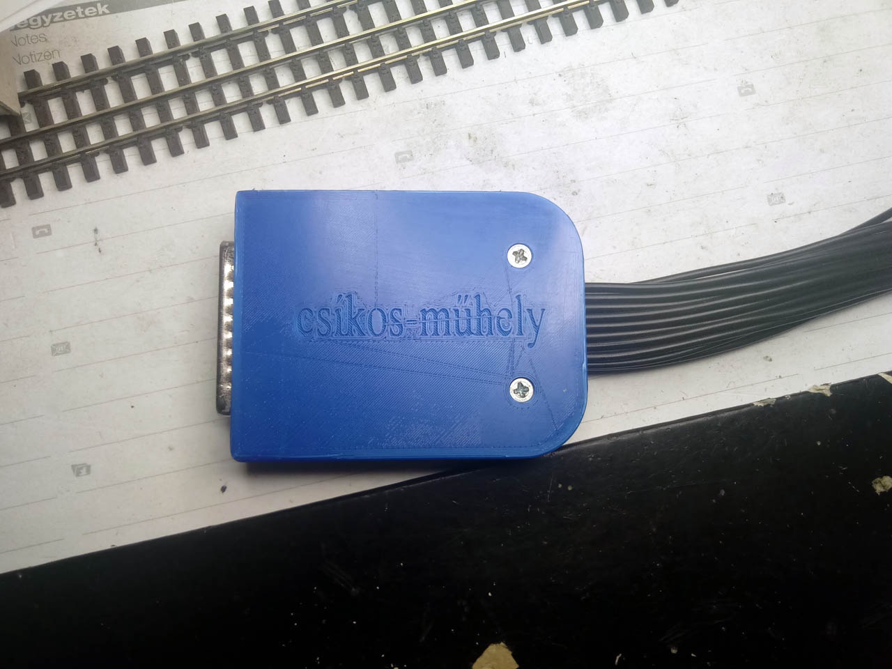 A terepasztalt és a kapcsolópultot két kábel köti össze. Az egyszerűség kedvévért két LPT nyomtatóport csatlakozós kábel. Csakhogy ezeknek a házát nem arra tervezték, hogy egy csomó, hozzájuk képes vastag vezetéket a házuk befogadjon. Szerencse, hogy van a műhelyben igényes munkaerő, akik tud már dolgozni AutoCAD programmal. Nos, gyorsan tervezett is hozzá egy új házat, és sebtében* ki is nyomtatjuk.