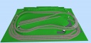 Szerettem volna még egy nagy kört külső íven, de sokkal mélyebb asztalt nem akarnék, így a nagy kört bezavartam a sínek alá (zöld szakasz). Pár pillanatra azért feltűnik a vonat hátul is  |