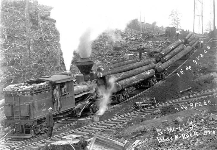 "Logging train at Black Rock in Polk County, Oregon, 1890's. 7 and 15% grade."
