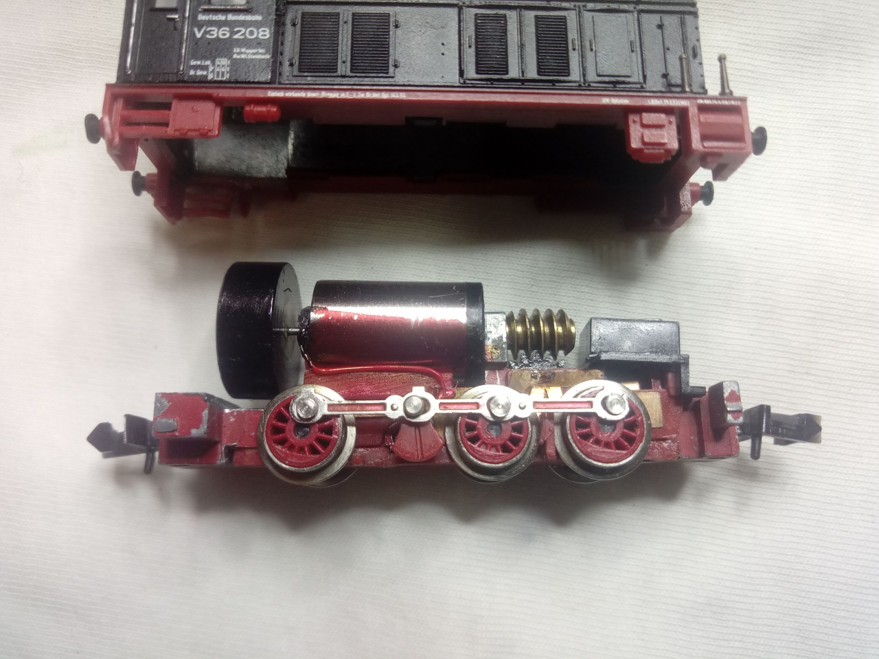 A másodikon egy Minitrix N V36, abban csak egy ponton pillanatragasztóval volt "rögzítve" motor, a csigánál. Most egy picit más a helyzet.