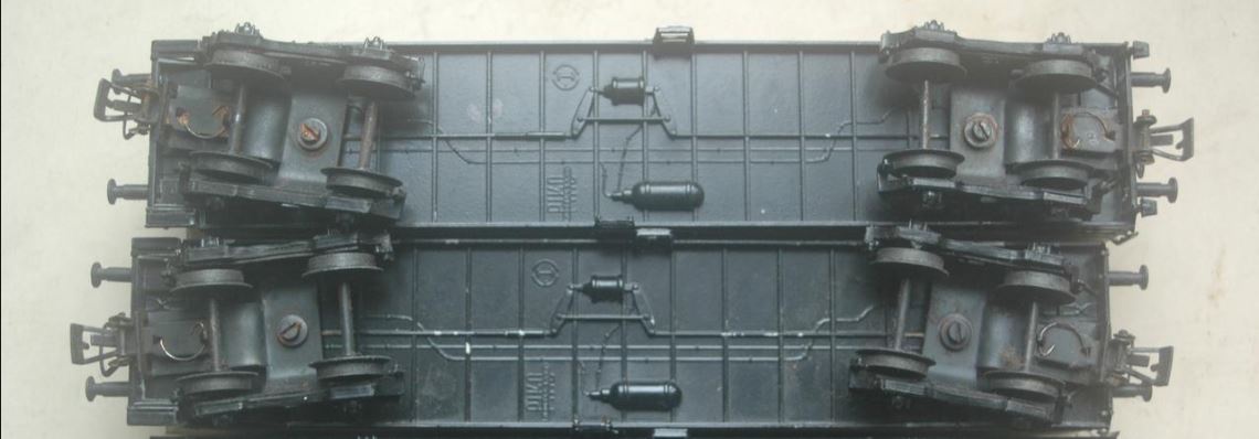 4. Van a gyártmányban "innováció". A hossztartó a szekrénnyel egy darabot alkot, a négy csapágyvilla, csapágytok, rugóköteg, függesztőszem pedig 4×1 külön kis kütyü, egyenként ragasztva. Csakhogy, a fakezű Jancsi és Juliska képtelen koppanásig (a helyére) tolni ezeket a mütyűrőket. Illetve: csak az egyik oldalt. Ennél fogva a kerékpárok tengelye és a vagon hossztartója még véletlenül sem merőleges egymásra. A trapézok minden változata előfordul, és paralelogramma is - csak a tégla nem.