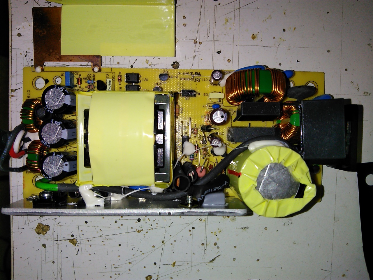 (A javításhoz használj leválasztó trafót, és nagyon vigyázz mert a képen jobb oldalt alul lévő szűrő kondenzátor, általában 330-470uF 400V-500V, fel van töltve, hatalmas birkózó gép és lórúgás.) |