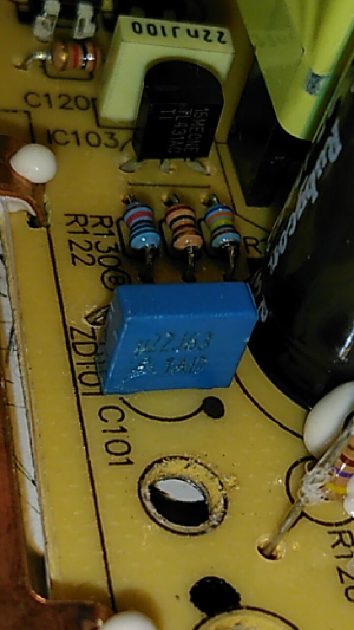Kérlek nézd meg jó alaposan, hogy az általad kiszedett 22nF hova van kapcsolva. A TL431 vezérlő elektródájára általában 2 db ellenállás van kötve, mert így lehet beállítani a Zener feszültséget. Fig 2; Fig 3. Ezt a vezérlő elektródát szokták hidegíteni 10-47nF kondival. Valószínű, hogy ezt találtad meg.