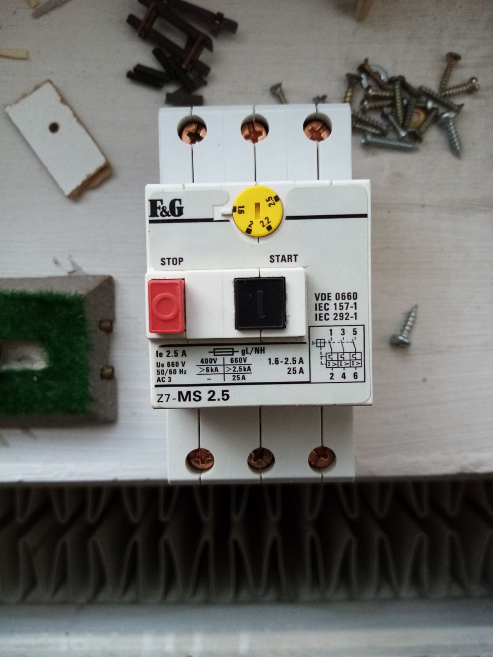 Rövidzár védelemre van egy kipróbált javaslatom. Azért nem jelentkeztem előbb az ötlettel, mert a gyakorlatban meg akartam nézni, hogy tényleg működik-e. A megoldás az erősáramú technikában használt motorvédő kapcsoló (a mellékelt fényképen). Ez lényegében egy olyan bimetáll, mint amilyen a régi Fz1-ben is van. Gyorskioldó ezekben nincs, tehát a pillanatnyi rövidzárakra érzéketlen. Tartós, erős túlterhelés esetén (teljes rövidzár) néhány másodperc után old ki. Nyilván ez függ a zárlati áramtól és a konkrét készülék névleges áramától. A képen látható típus névleges árama 2,5 A. Nálam az AC körben (váltók, jelzők, szétkapcsolók) a trafó zárlati árama kb. 20 A. Sokszori tesztelés során sem kapcsolt le pillanatnyi (kb. 0,5-1 mp) zárlatokra. Tartós zárlat esetén viszont kb 2-3 mp után kikapcsol. Kikapcsolás után viszont kézzel kell visszakapcsolni. Ez nagy előny az Fz1-hez képest, mert az ki-be kapcsolni fog amíg a rövidzár fennáll és a végén a hibás alkatrész füstöl. |