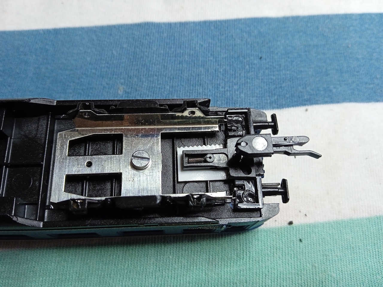 Az első képen látszik, hogy a kocsikapcsoló nem a forgóvázon van immár, hanem a kocsi alvázához van rögzítve. A kivágások miatt a forgóváz szabadon tud mozogni. Az eredeti, csőszegecses forgóváz rögzítés helyett egy M2*6mm csavart és anyát alkalmaztam. A PEHO101 kinematikát a csomagban talált, gyár által mellékelt kétoldalas ragasztóval rögzítettem. Az ütközőket, és a lépcsőket pedig fogpiszkáló hegyével felvitt pillanatragasztóval.
