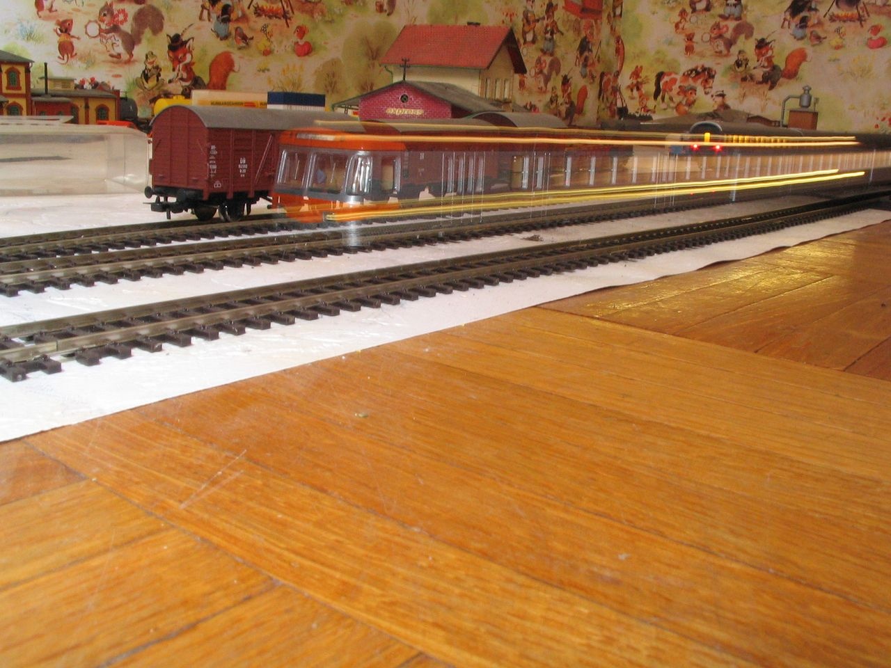 A tetőt és a sárga csíkot Bátyám fényezte újra, én meg elektronikát raktam bele, szokásos saját készítésű dekóder szünetmentes áramforrással. Rá lehet programozni a vontató jármű címére, így ha az irányt vált, a vezérlő kocsin is megtörténik a fényváltás. Jah, és kapott még új kerekeket , és utasokat is.