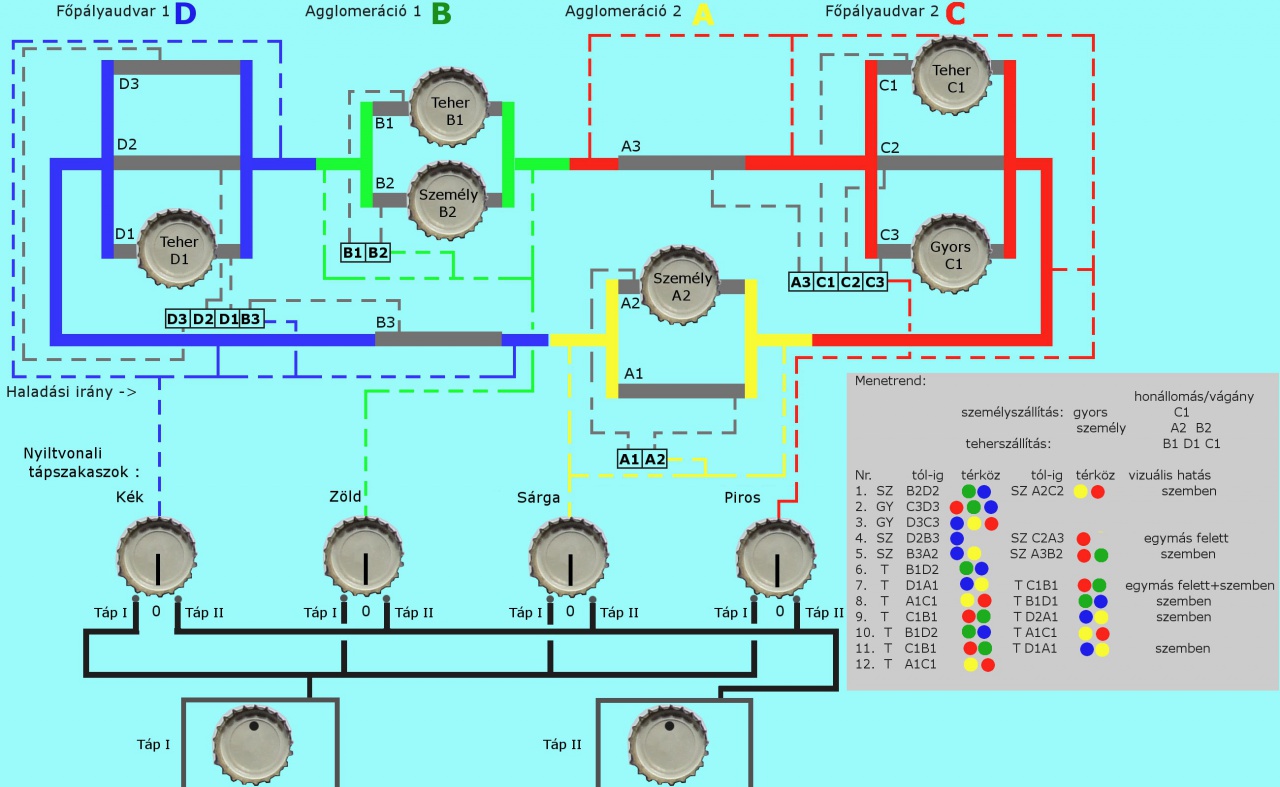 A fejre állított söröskupakokkal modellezett tápfeszültség állítás, vonatmozgások rendben vannak,