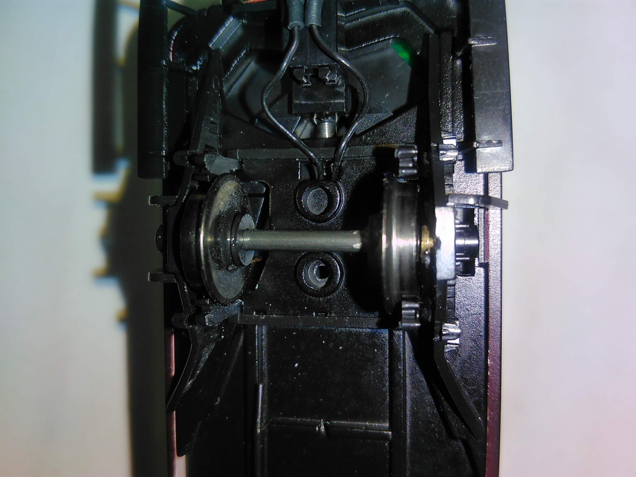 A nem megfelelően - üzembiztosan - elhelyezett érintkező rugók, a folyamatos próbálgatások miatt, a futások alatt egész vályút alakított ki a keréktárcsa szigetelő anyagában. Mivel itt a másik oldali polarítás is jelen van, ezért az érintkező rugó, helyét keresve összevissza érintkezett, és rövididejű zárlatot is okozhatott, amitől a felhevült, megégett, ne felejtsük álltalában valamilyen bronz, vagy rugóanyagból készült. Ez a felmelegedett huzaldarab már egészen szép barázdát tudott a műanyagba olvasztani.