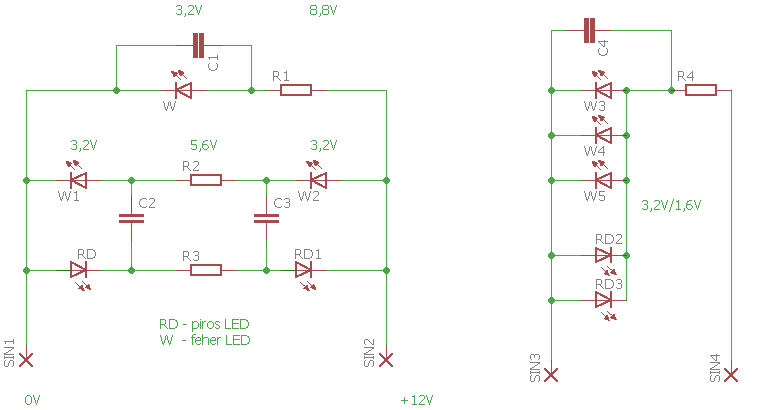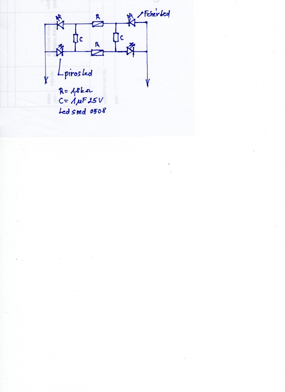 Ha ki tudod alakitani ugy az áramkört hogy a fehér meg a vörös fény összekombinálhato, akkor megsporolsz 1 ellenállást. A két LEDet antiparallel kötöd, akkor mindig csak egy fog világitani a másik meg védeni fog.