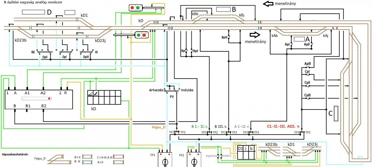 Megértettem,hogy a tárgyalt vezérlés nem valósítható meg olyan módon,hogy az ABC állomást magába foglaló pályaszakasz -az állandó menetirányhoz tartozó polaritással- a tápegységekről szabályozható,a fejpályaudvar menetirányai pedig -ezen fix,állandó polaritású betáplálás mellett-csak a relé vagy 2 pólusú kapcsoló által.Bár mivel a 2 pólusú kapcsolóm fizikailag ON-OFF-ON kivitelű, a két áramkör szétválasztható lenne egymástól szükség esetén.