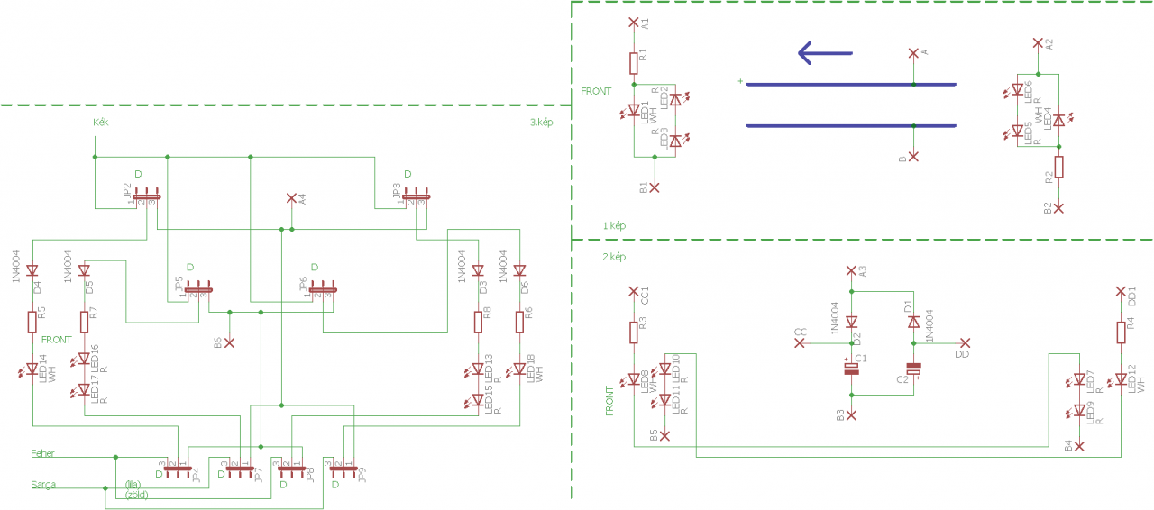 Ezeket meg vagy az 1 kép szerint vagy a kolléga rajza szerint bekötöd, de csak összesen 4 LED (csoport) lesz, a rajzon csak 2+2 a két oldalon. Csak az ellenállásokat kell nagyobb teljesitményüeket használni (0,5W-1W), mert a fehéreken kb 100 mA fog folyni.