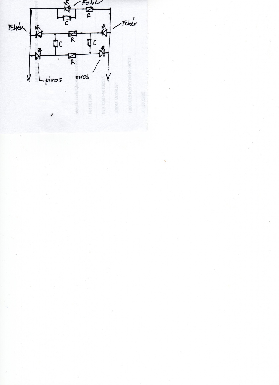 Idézet: „Ha ezt igy akarod, akkor kösd a 2 piros LEDet sorba, majd a fehéret ellenkezö polaritással párhuzanosan a piros LEDek szabad lábaihoz. Egy soros ellenállással (kb 1 kOhm) már mehet az egész a sináramszedökhôz. Az egyik irányban a fehér a másikban meg a 2 piros fog világitani” .