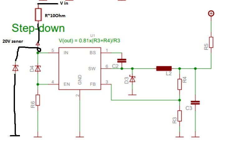 Most te érted félre. Ha a Vin bementre 16 V ( a zener szerint) kisebb feszültség jut, akkor már müködésbe léphet az EN. A 16V zener ezt biztos nem korlátozza. Azaz, ha elindul a stepUp 9,5 Voltja az azonnal leállitja a StepDownt mert a bemeneten csak 9,5 V lesz.