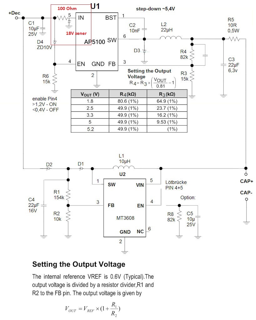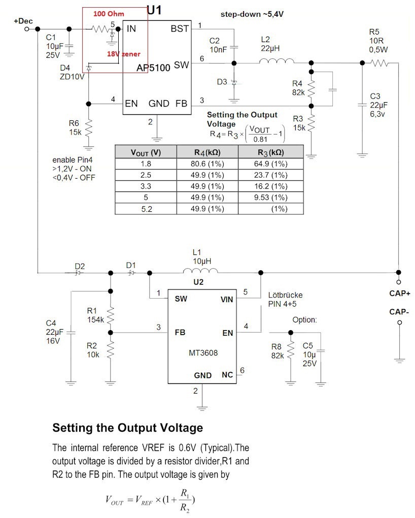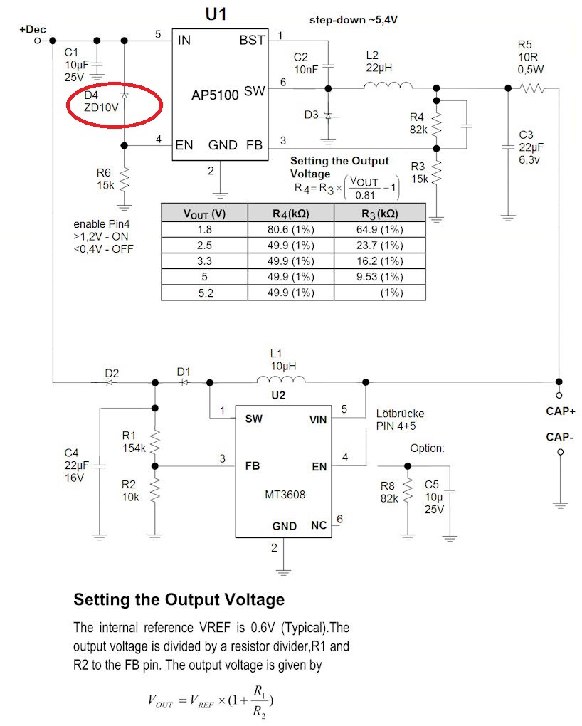 Alább látható a töltő/visszatöltő teljes áramkör. A kérdésem a pirossal bekarikázott 10V-os Zener dióda a StepDown részben.