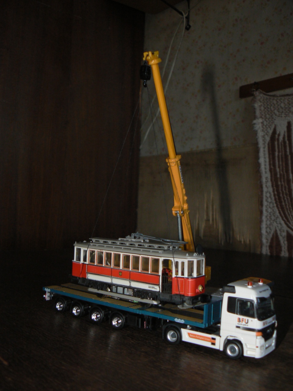 Az eredeti KRC1200 darut a Lipcsei Kirow gyár gyártja, és minden megrendelő kap egy modellt is, egy szép plasztik dobozban. A modellt egy lipcsei kisszériás modellező késziti "resin"-böl. (nem tudom a magyar müanyag név megfelelőjét). Egy modellező barátom Jena-ban, tudott egy modellt szerezni nekem 250,-€ áron. Mivel ez egy kiállitási modell, egy asztali disz, igy egy-két dolgot át kellett alakítanom, friziroznom: kapott fém kerekeket, Roco Kurz kuplungot, fékcsöveket, és ha már egy daru, akkor legyen rajta drótkötél is. Feketére festettem az irányitó fülke ablakait és utána 0,2 irásvetitő fóliából "üveget" is kapott. Mivel az eredetin azért kipufogó stb is van igy ilyen apróságokat is felragasztottam rá. A mellék kocsi, ami a gém alatt van mozgatás alatt egy ROCO 4 tengelyes nehézteher kocsi.