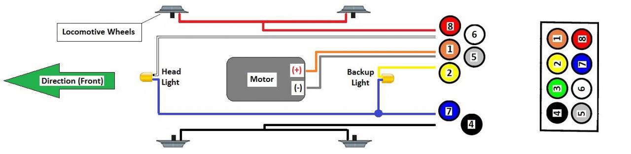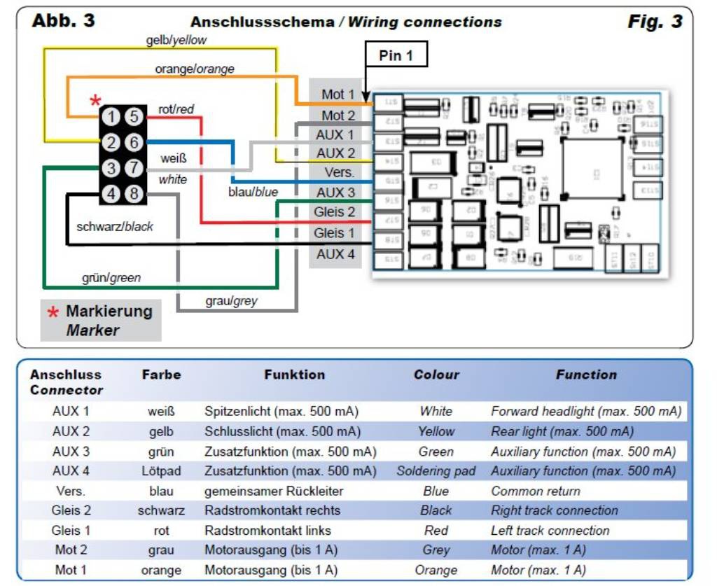 Ez annyival több, hogy a 3. lábra (eredetileg az üres volt) kivezették a zöld vezetéket, vagyis az AUX1 tartalék funkciót. Pl. a ROCO gőzösökben, ha ilyen aljzat van, akkor a füstgenerátort lehet ide kapcsolni. |