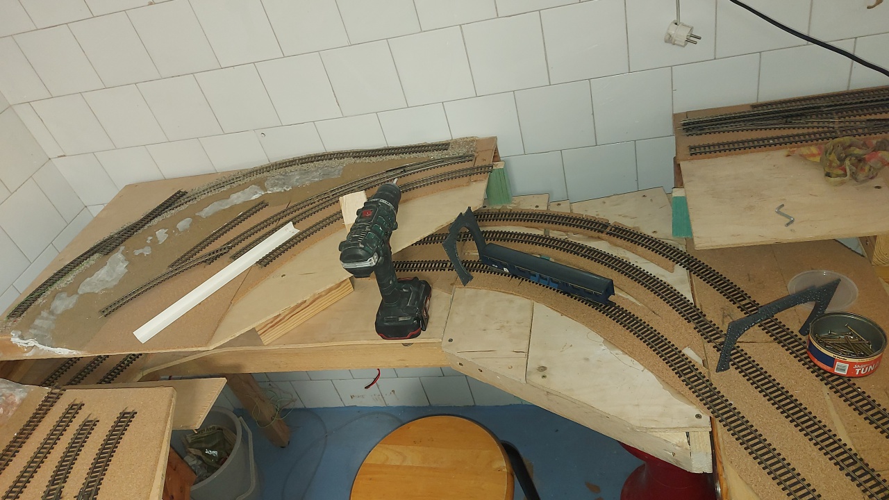 Még egy "apróság" jutott eszembe. Megnéztem néhány helyen az íves szakaszokon a vágánytengely távolságokat. Volt ahol alig több, mint 50 mm-t mértem. Ez nagyon kevés, H0-ban gondolkodva ennek legalább 65 mm-nek (de inkább többnek) kell lenni, mert különben egymásba érnek az űrszelvények. Ugyanez a helyzet az alsó állomáson is, túl közel vannak a vágányok egymáshoz. (meg némi peron is kellene). Nyilván TT-ben jobb a helyzet.