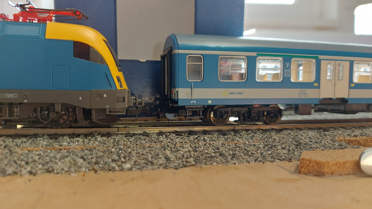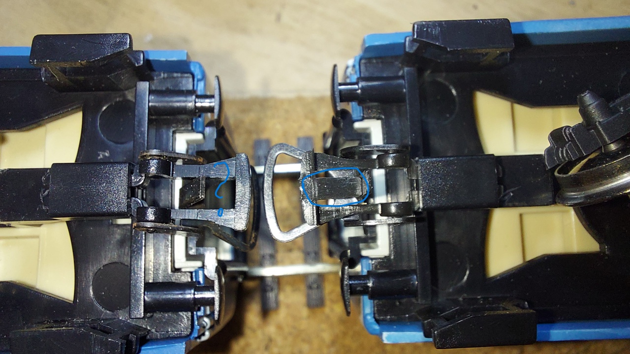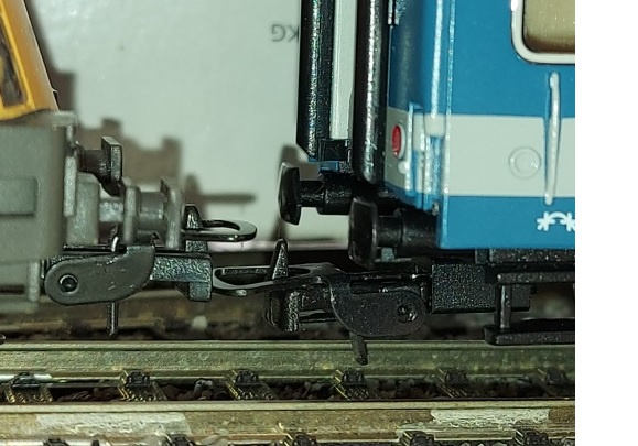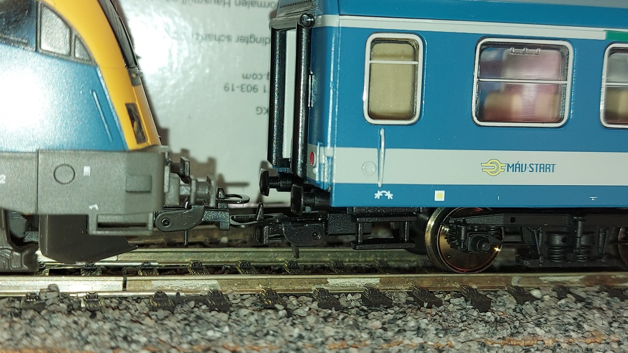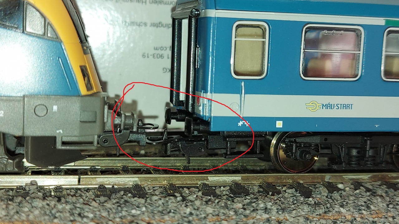 Annyit megjegyeznék, hogy ezekhez a kinematikás kocsikhoz - főleg tolt üzemben - nem igazán jó ez a bügel kuplung. A közelkapcsoló kuplungok (roco-fecskefarok/FL/univerzál) és a kinematika lényege, hogy összedolgoznak - azaz rögzítik a két vonószerkezetet, így ívben eltávolodik (tolt üzemben is), egyenesben viszont közelre húz.