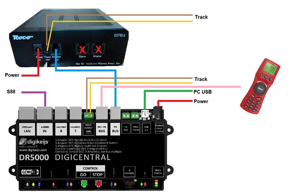 DR5000 lenne a fő központ, ez menne a pályára a vonatoknak. ROCO 10764 (ez van itthon) meg booster-ként működne a váltó állító és jelző moduloknak. Kb. 12 Digiservo és 10 Digisignal