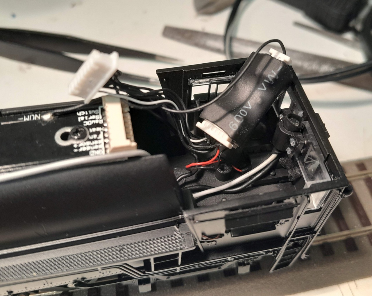 Szerencsére volt passzolo fogaskerék, de jo 2 orát dolgoztunk a mozdonyon. Itt is csak bebizonyosodott, hogy a tapadogyürük könnyen kinyirhatnak ilyen mozdonyokat. Egyszerūen figyelembe kell venni, hogy a modellmotorok elég erösek és egy nehéz mozdony hosszabb vonattal nem fogja elforgatni a sineken a kerekeket, ami vagy a motort nyirja ki vagy az áttételt. |