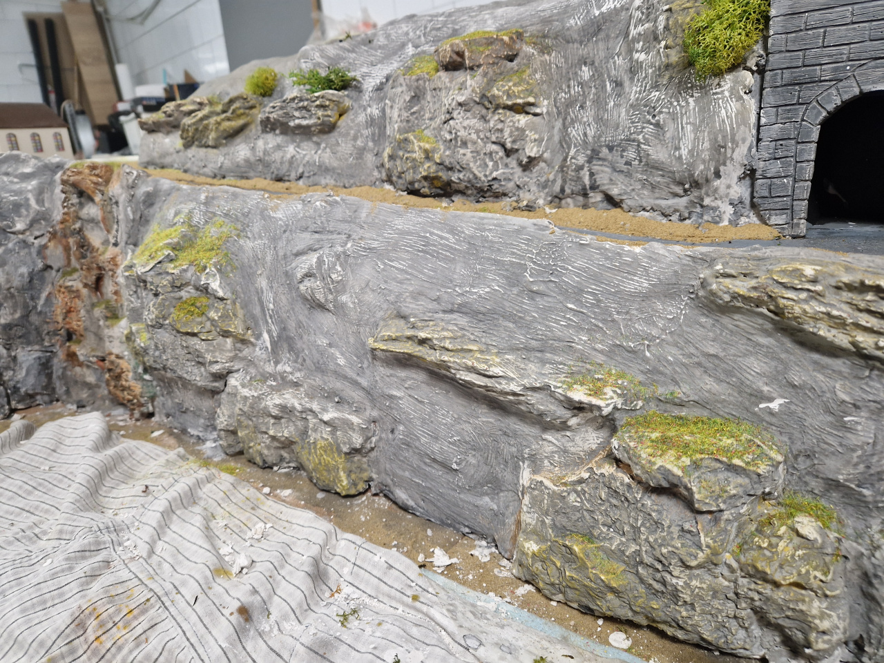 Végre összeállt az asztal. A terepépítés az egyik felén már majdnem befejeződött. A sziklás részt kb 3x kellett újrafesteni mire ezt elértem. |